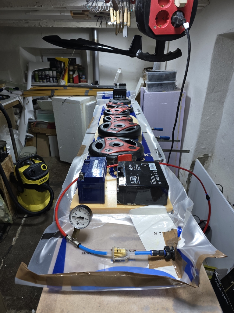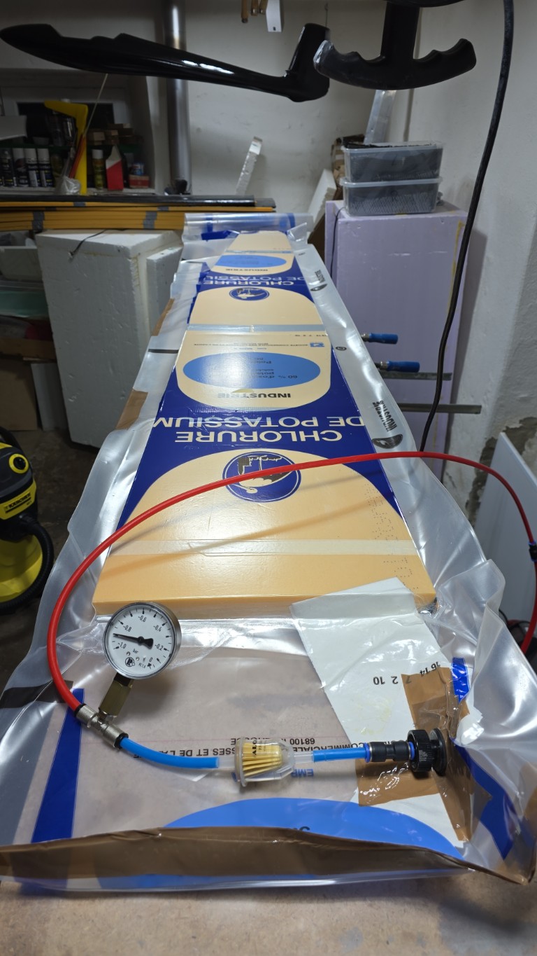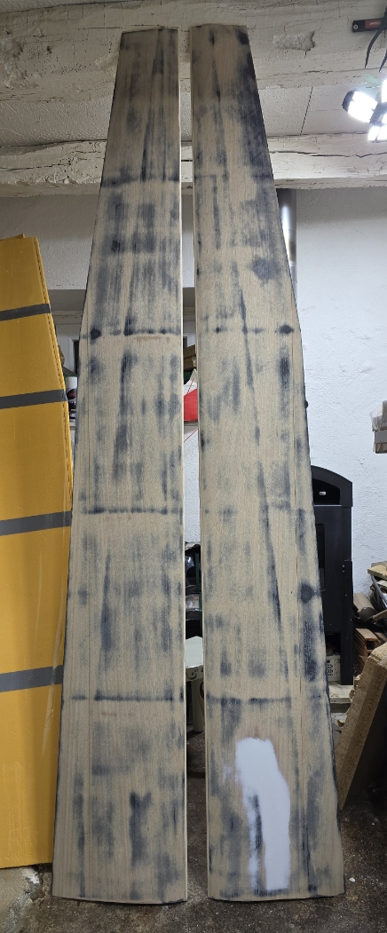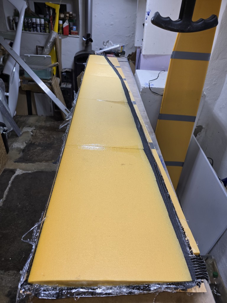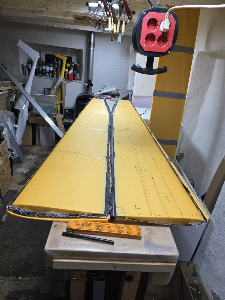 Ich will ja kein unnötiges Gewicht mit mir rumfliegen, was nichts zur Stabilität beiträgt, sondern eher zu einer "Glashärte", also zu einer erhöhten Bruchempfindlichkeit führt am Ende. Also wird das Furnier natürlich niemals gesperrt sondern darf und soll das Harz, das ja nicht in das XPS eindringen kann, im Gegensatz zu Styropor, was "zuviel" ist aufnehmen.