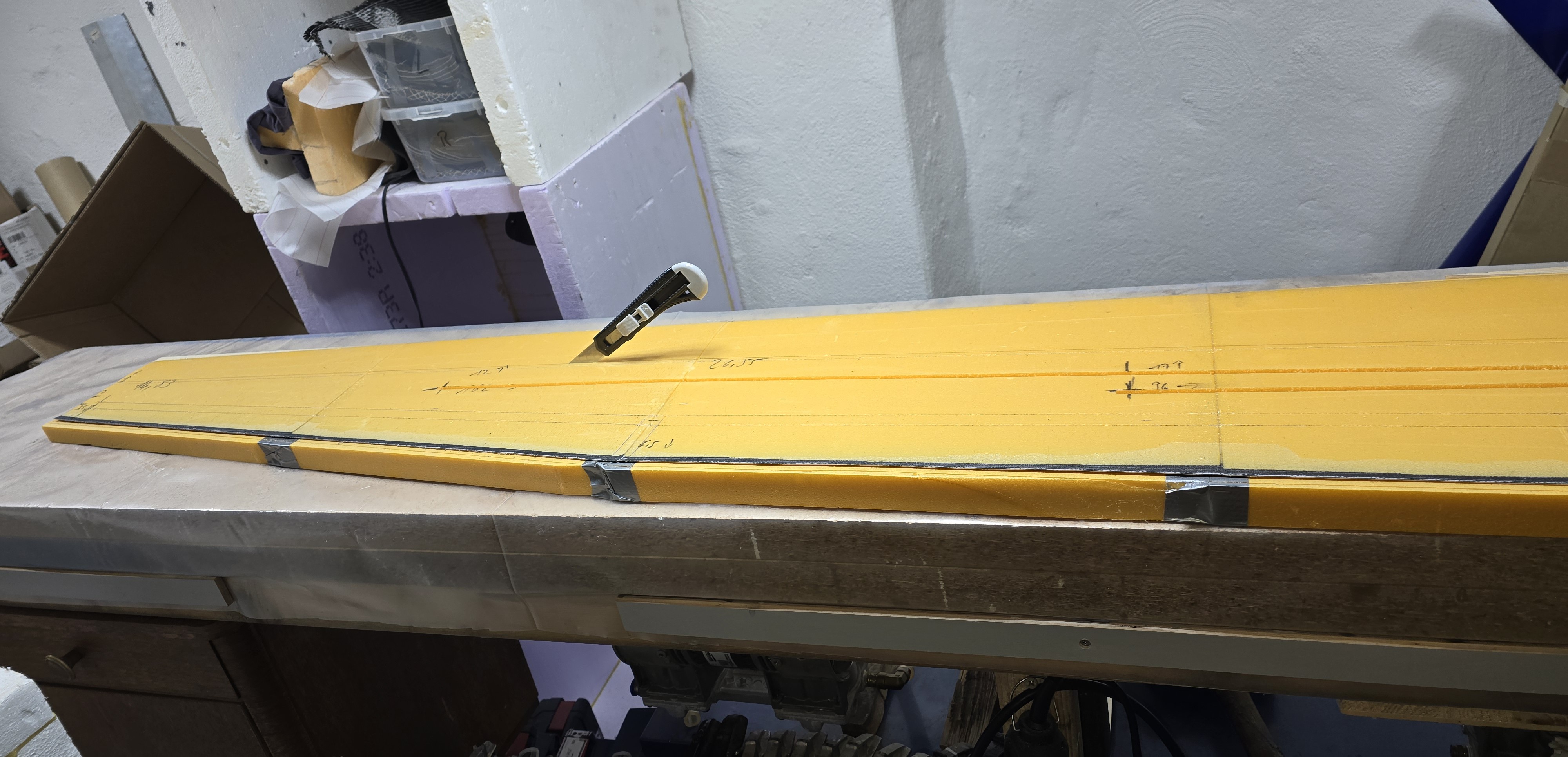 3x45cm und 2x40cm (Edit: Meine CNC ist "nur" noch 69cm von Drahtauflage zu Drahtauflage breit. Dadurch habe ich viel sauberere Kerne, man ist gezwungen die Aerodramatik sauberer zu basteln und die möglichen Schneidewinkel sind damit dann halt ungleich höher als bei der alten Variante mit 1,3m Breite, in die halt aber die Platten zum ablängen Quer gepasst haben. ...einen Tod muss man halt sterben, ich in dem Fall lieber den, dass ich neben der CNC noch einen alten Tisch stehen habe, auf dem der alte, breite Bogen liegt und ich dann eben von Hand ran muss....)