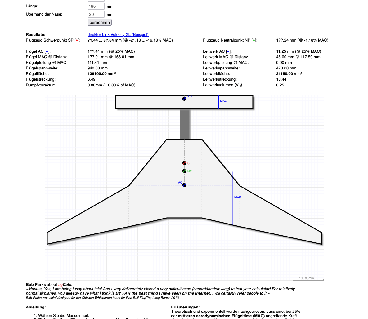 - x(CG) ermittelt sich dann aus dem Produkt m(n) mal Abstand x(n) zum Referenzpunkt dividiert durch das Gesamtgewicht - nur mal grob gesagt, beim Laufen mit dem Entlein am Boden, um den Schwerpunkt (CG) mal zu testen, muss die Canardfläche immer zuerst Auftrieb erzeugen bevor die Tragfläche zu tragen beginnt