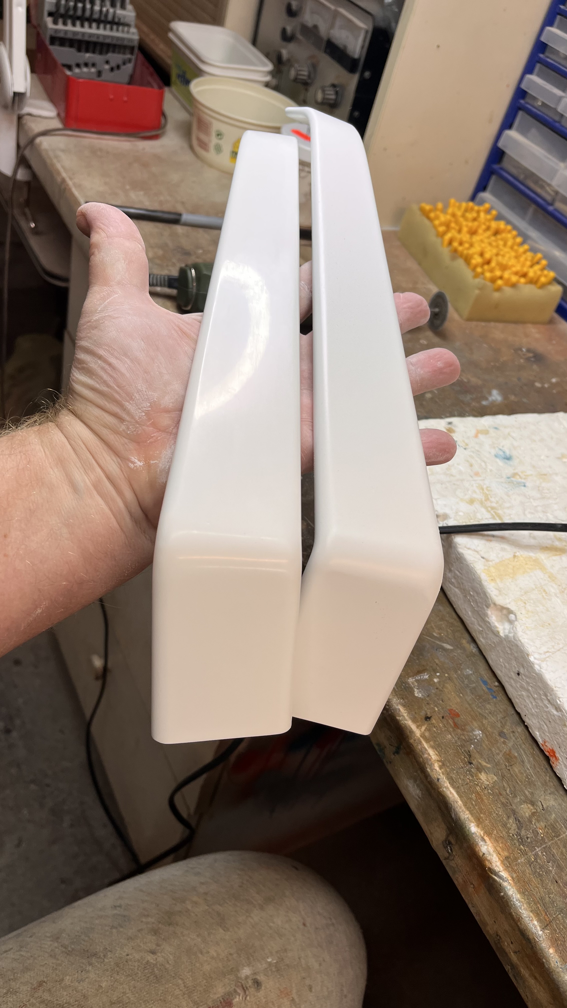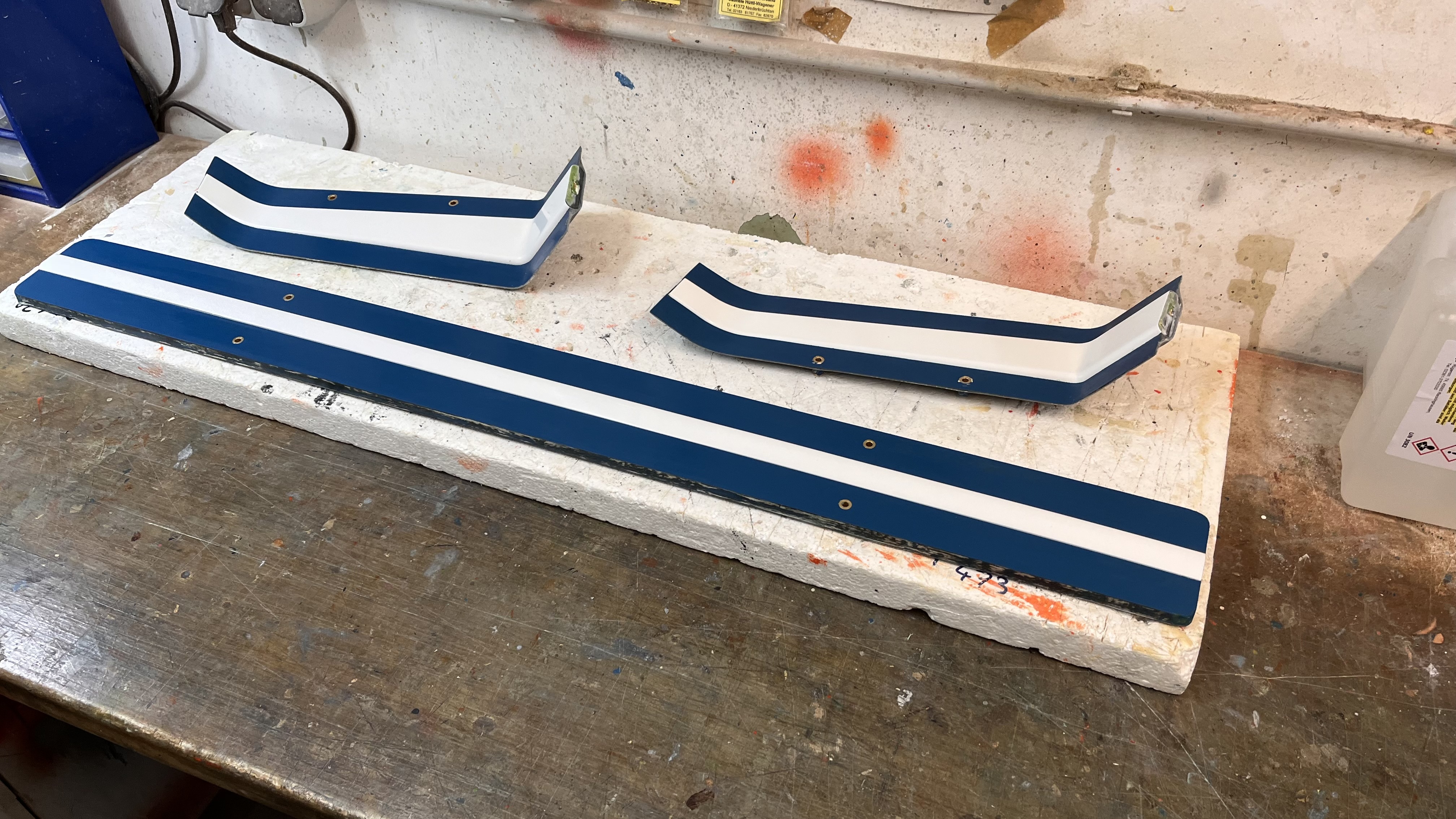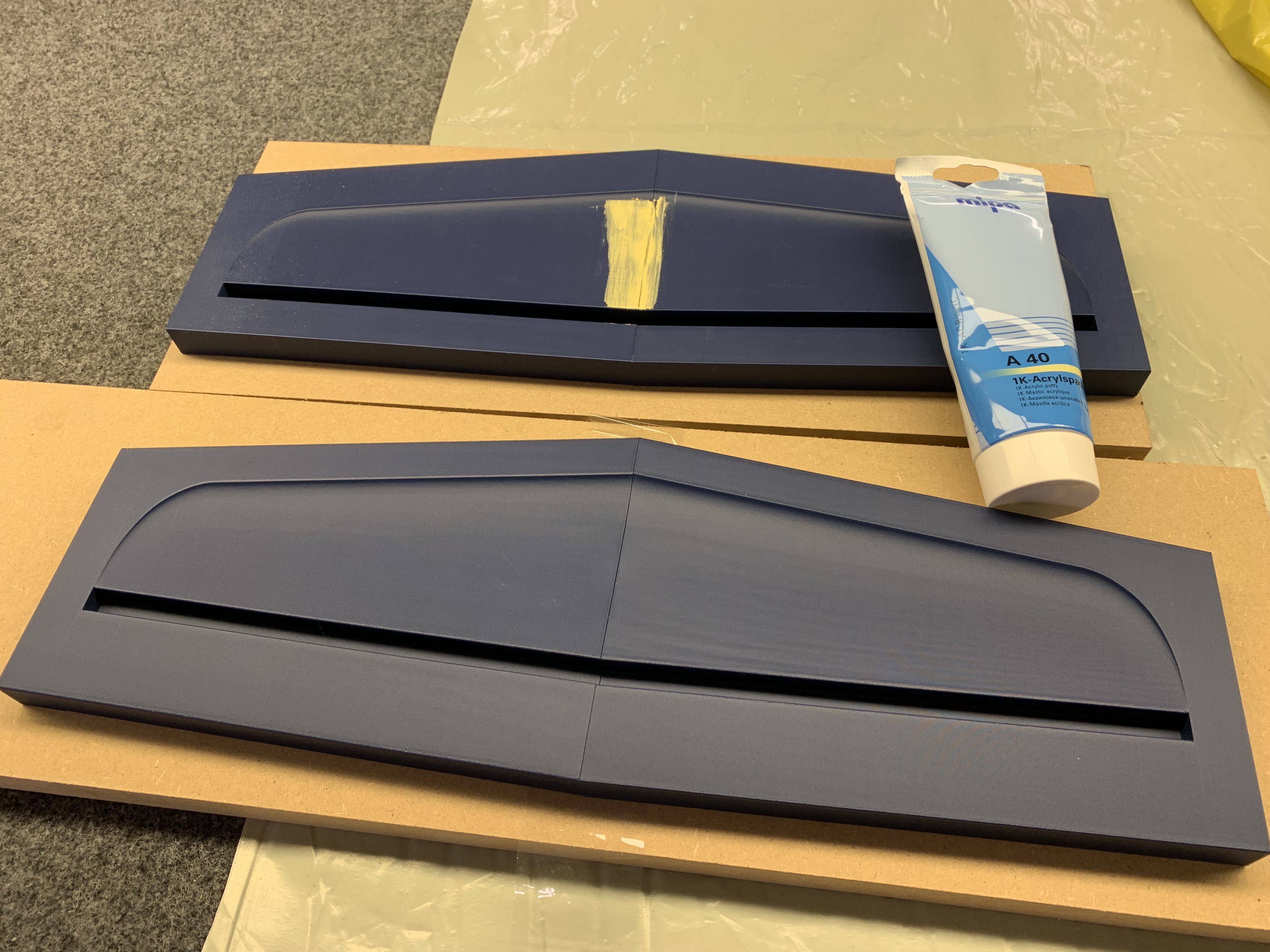 Ja es ist ein kompletter hohlkörper in der form lackiert und soll keine Nachsrbeit haben. An den Verschraubungspunkten mit balsamumpe(microballon mit epoxy in Balsakonsistenz nach Härtung)gefüllt und an den Nasen auch gefüllt mit balsamumpe ggfs faseranteil und die blindverklebung mit Aerosil.