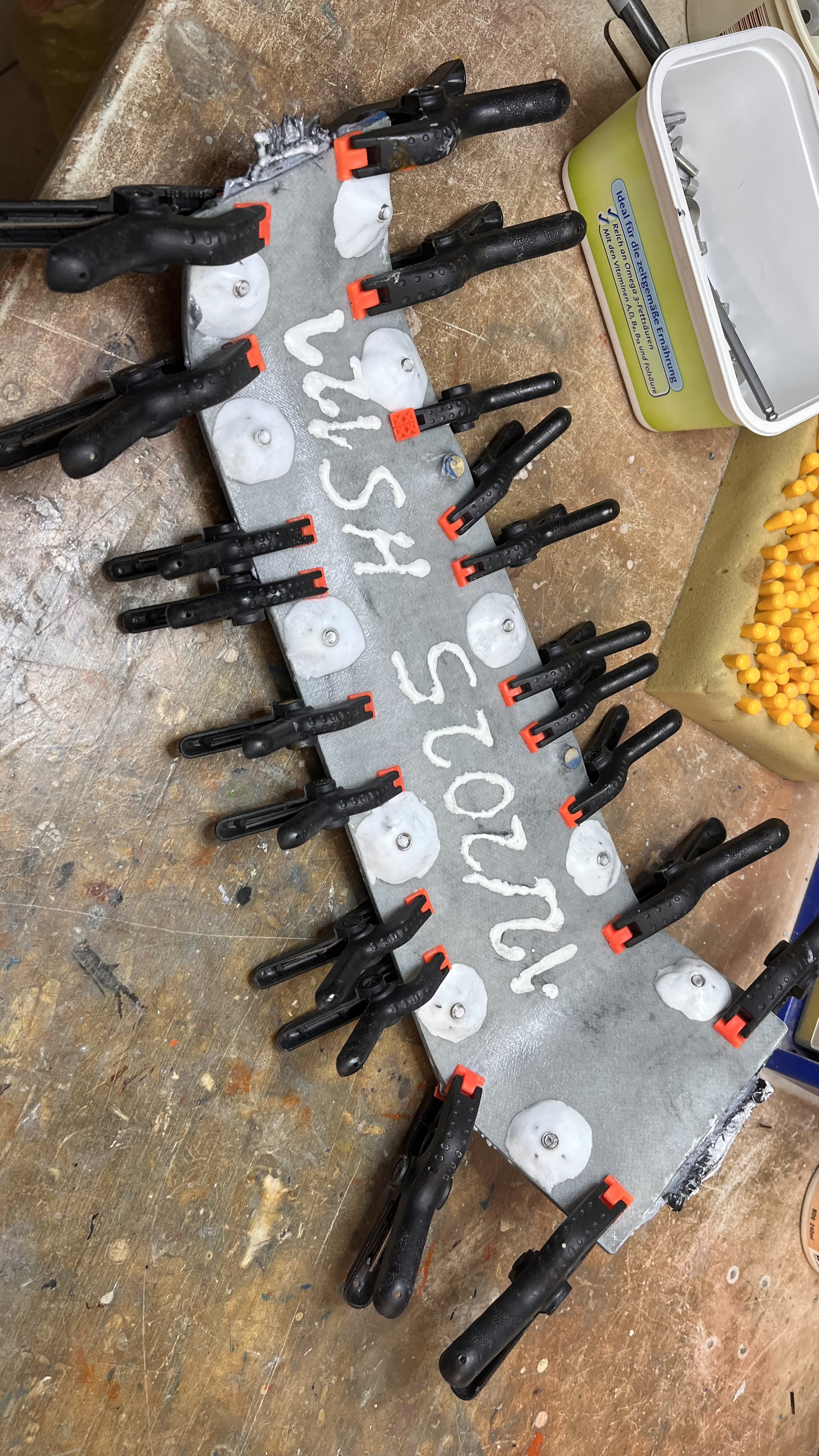 Am ende dann mit gemahlener CFK Mumpe verklebt und aerosil grau direkt a d Kante. Microballon Mumpe i Balsakonsistenz dann an der Schraubflächen wo gebohrt wird. Form verschliessen und verschrauben an den enden kommen die Würste mit überschüssiger Mumpe raus…..