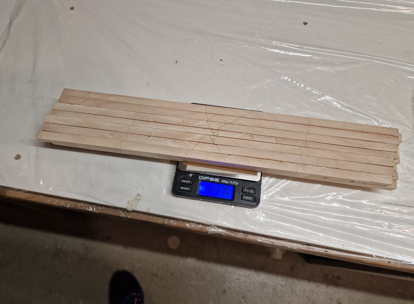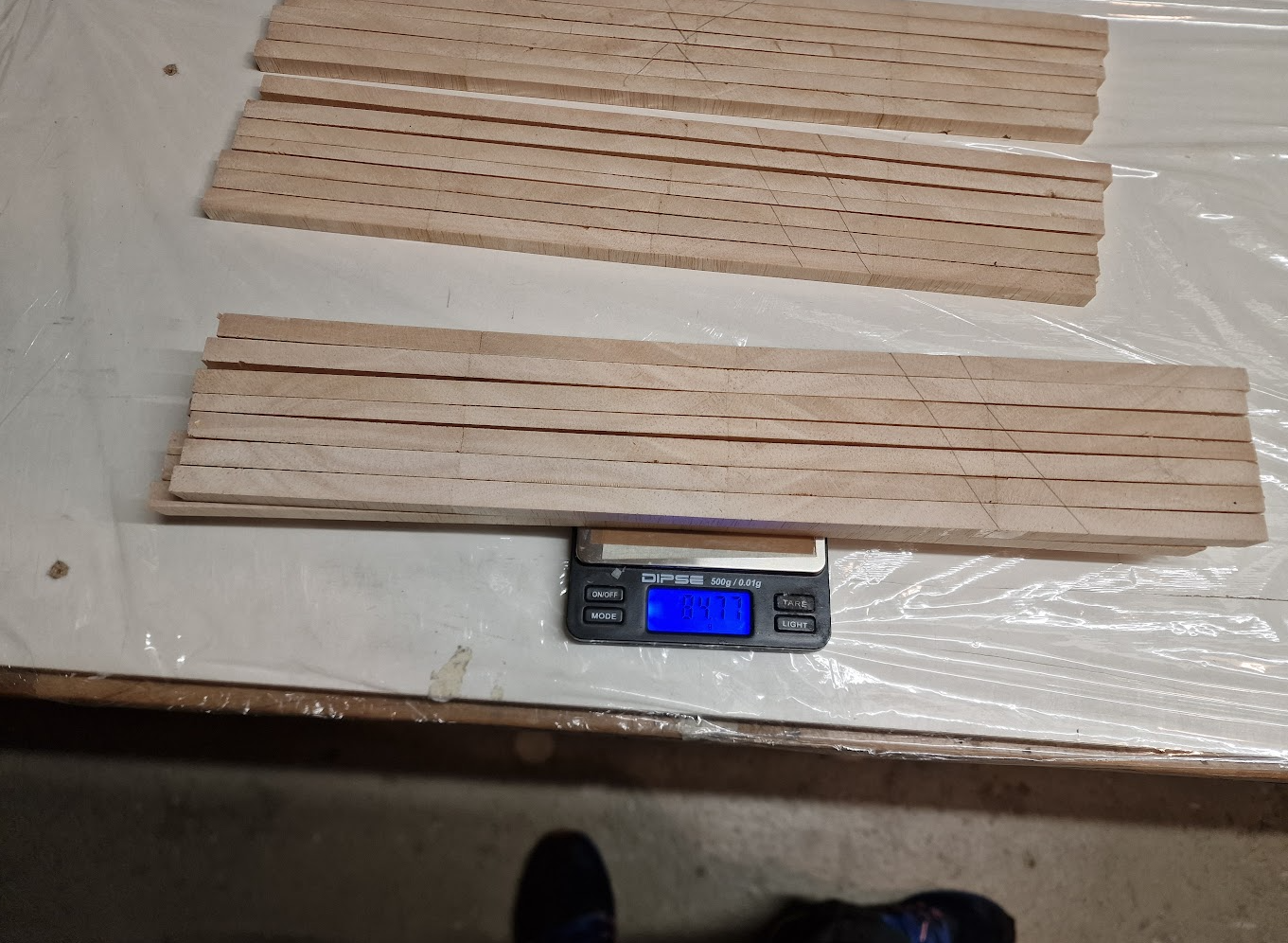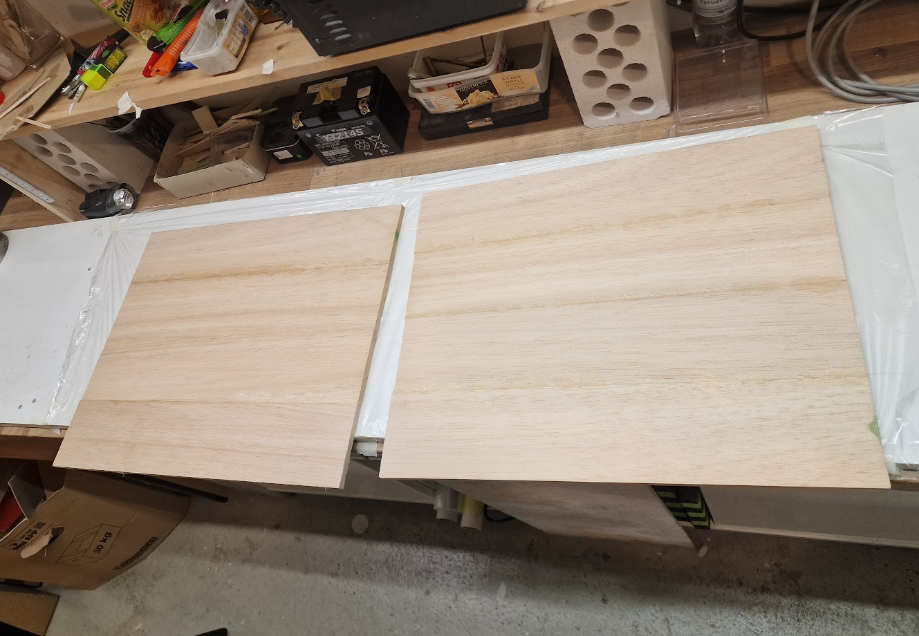 Die ersten 3 Trapeze, auf dem Kopf liegend... Auf dem Bild erkennt man den Knick kaum. Die nächsten beiden sind annähernd waagerecht und dann geht's mit den stärkeren Knicken am Aussenflügel los. Der letzte ist dann stark angewinkelt mit ordentlich Pfeilung, das wird noch spannend zu schneiden, da komme ich aber dann erst morgen dazu...