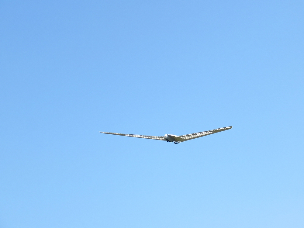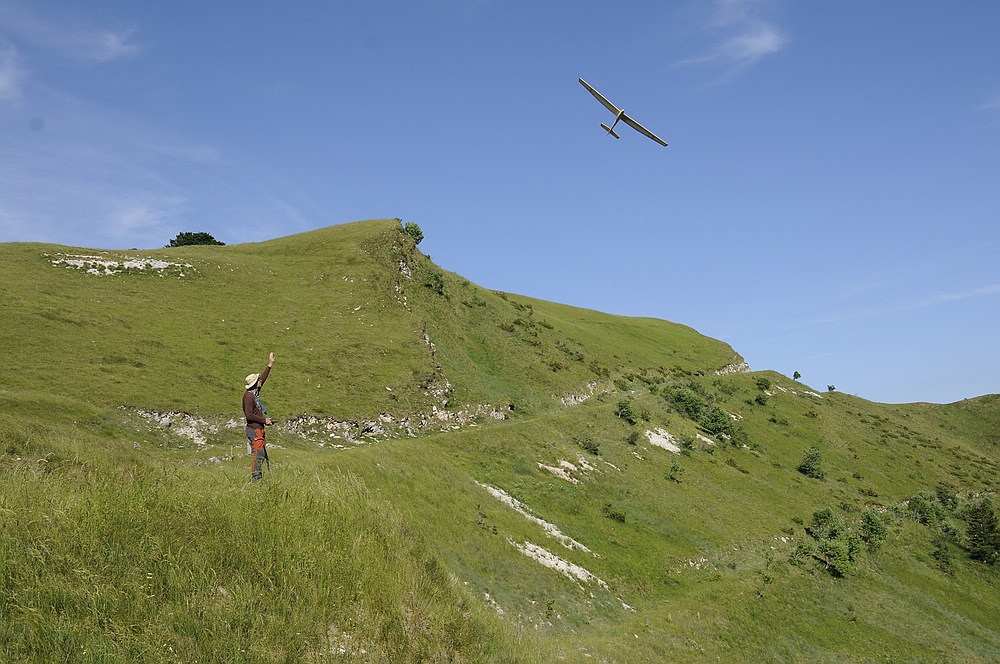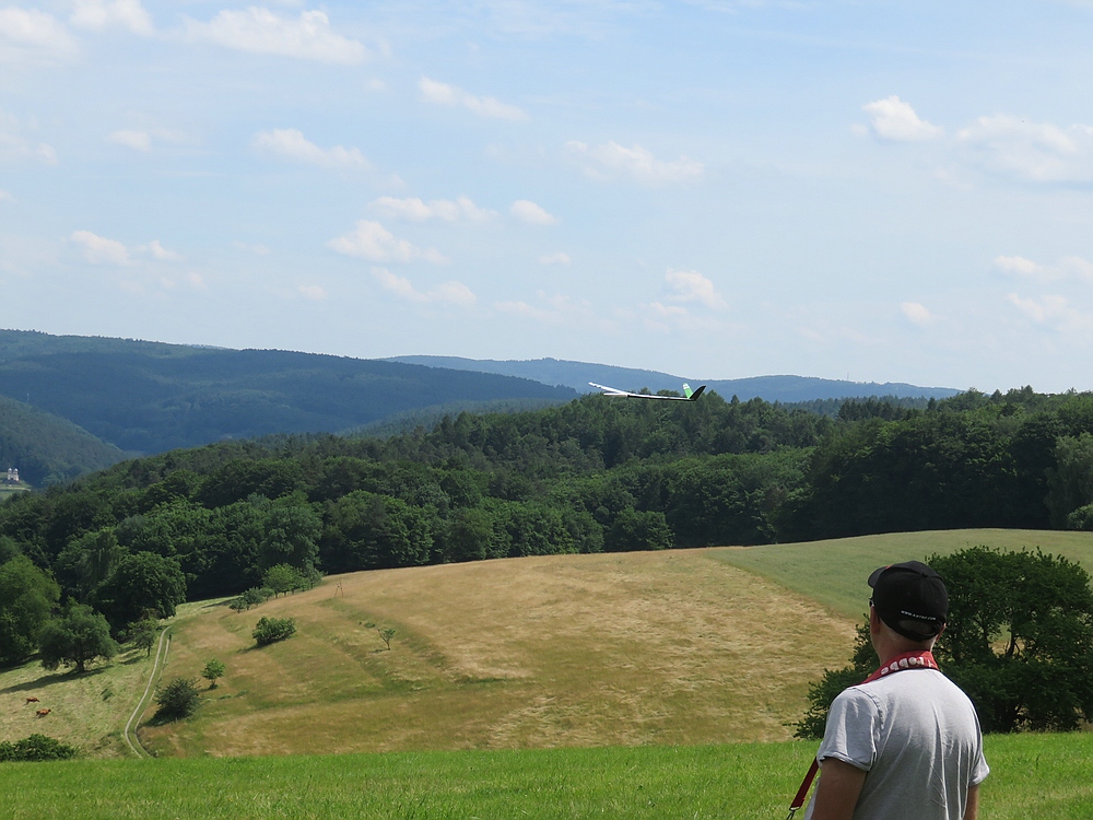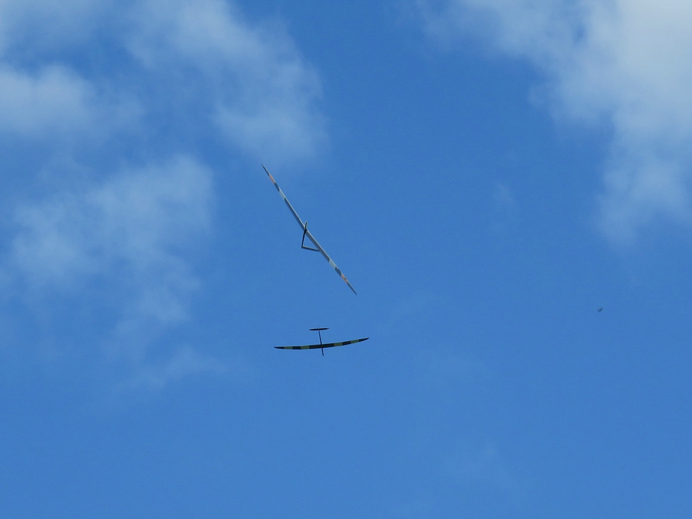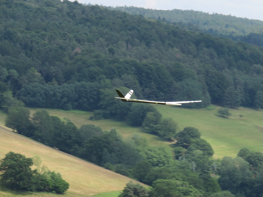 Am frühen Nachmittag mit weniger Wind und mehr Thermik machte die Luft die Flieger recht schnell, sogar die kleine 1,25 m Horten IX machte als PSS mehr Spaß als mit Impeller und durfte auch ein paar flotte DS-Runden drehen.