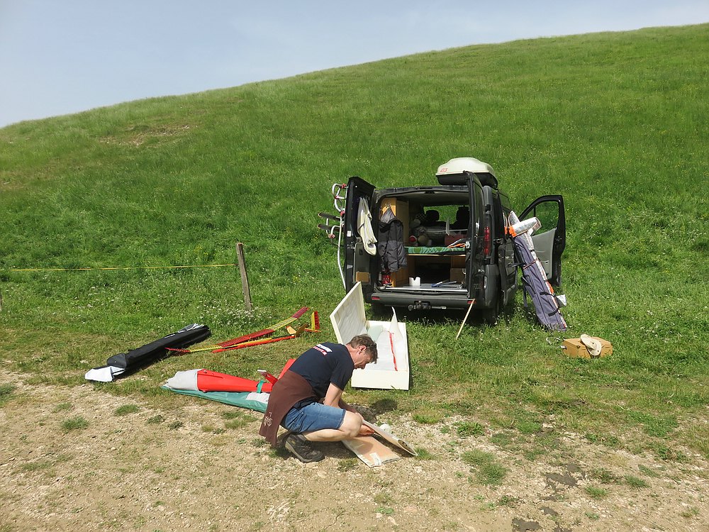 Kurz vor 19:00 Uhr konnte sich auch der thermikstarke F3B´lerr nicht mehr halten, Zeit für Abendessen und Werkstatt um die zweite Flügelformhälfte vom Azorace Mini zu schließen...jetzt ist wirklich Feierabend :)