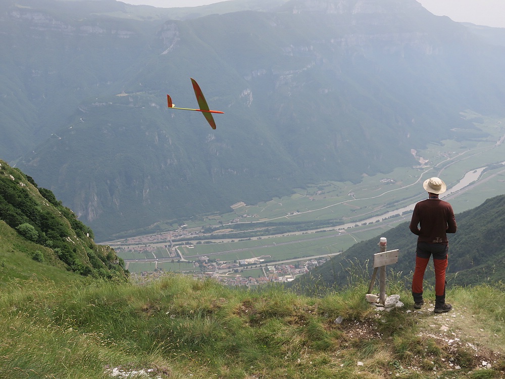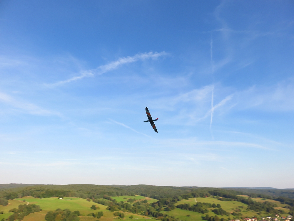 Am Ende durfte der 76 cm Lilloo sogar noch einige DS-Runden mit geschätzt 70-80 km/h in der Windscherung zwischen Abendthermik und dem Lee über der Landewiese drehen...bei ein paar Runden zusammen mit einigen Schwalben die aus der Windscherung ebenfalls Flugenergie gezogen haben.