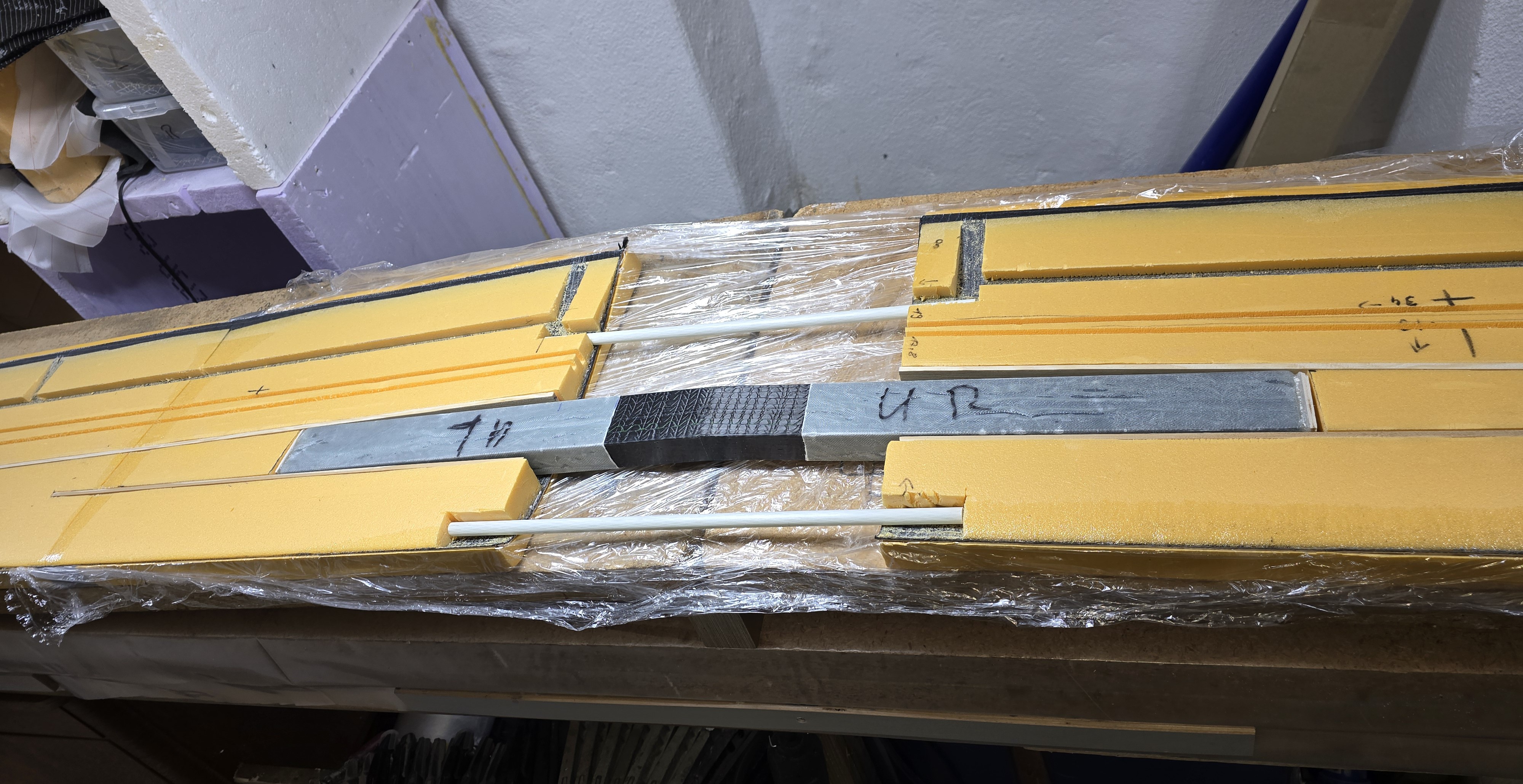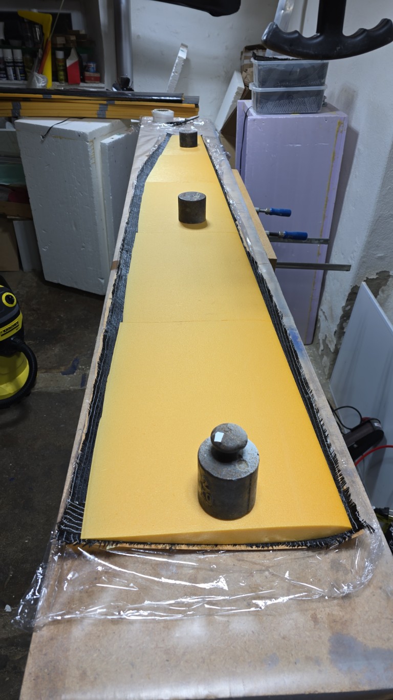 Ich will ja kein unnötiges Gewicht mit mir rumfliegen, was nichts zur Stabilität beiträgt, sondern eher zu einer "Glashärte", also zu einer erhöhten Bruchempfindlichkeit führt am Ende. Also wird das Furnier natürlich niemals gesperrt sondern darf und soll das Harz, das ja nicht in das XPS eindringen kann, im Gegensatz zu Styropor, was "zuviel" ist aufnehmen.