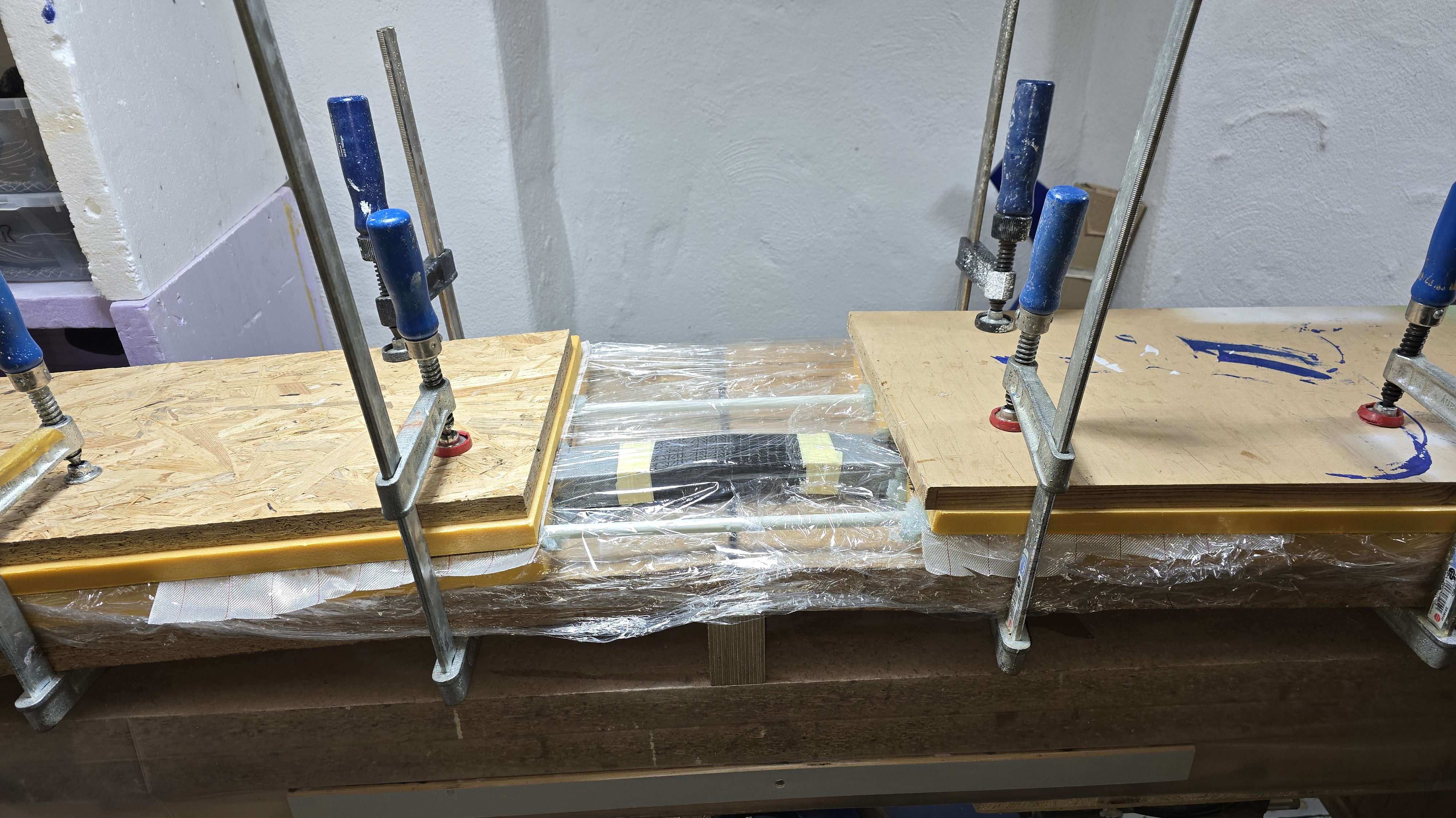 Kerne sind verklebt, Schalen sind getaped, jetzt geht's ans Gelege und Furnier schneiden, morgen kommt dann die erste Hälfte in den Sack.