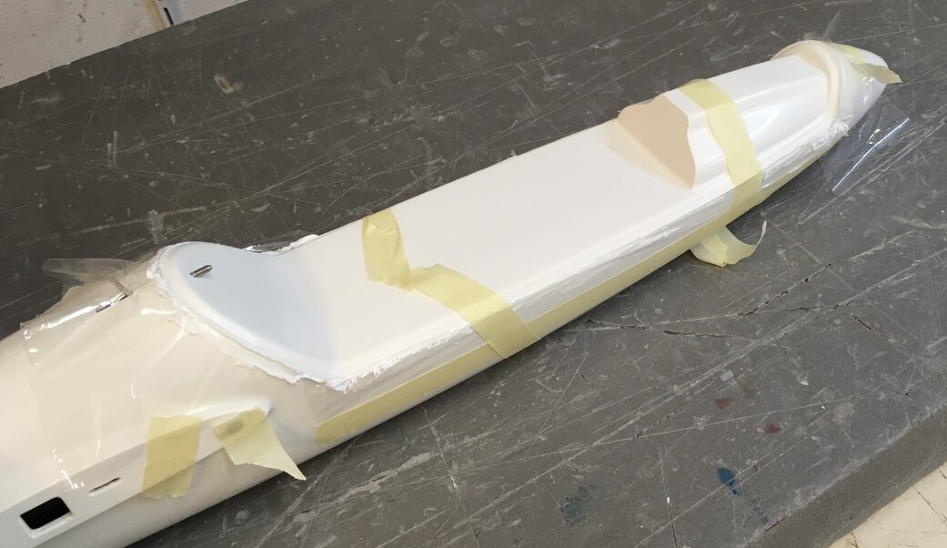 Der Rumpf wurde isoliert und 3 lagen Glasgewebe mit Vakuum auflaminiert, Instrumente ergänzt und alles gefüllert, abformfertig: