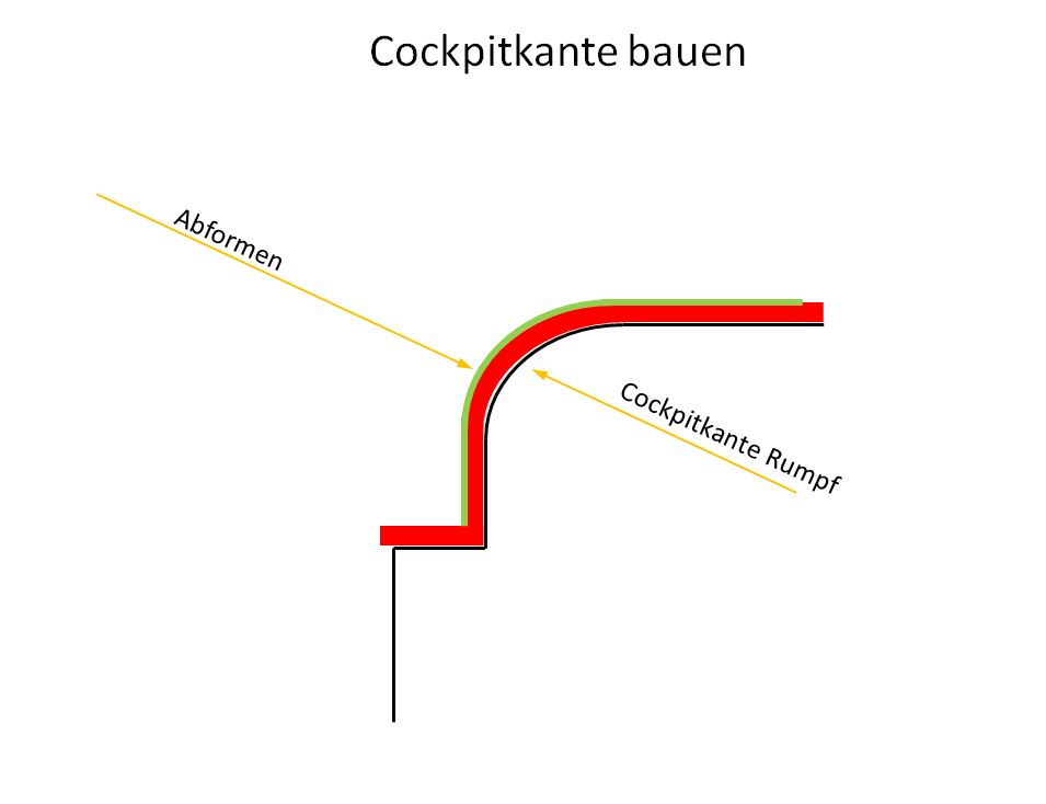 Wenn man dann den Rahmen in dieser Form laminiert, hat man etwa 1mm Luft für das Glas über bei grob 3 Lagen 163er Köper, also den perfekten Abstand um die Haube aufzukleben. Vorher drückt man den fertigen Rahmen in ein, auf die Sicke auf dem Rumpf per "Zuckerbäcker-Spritztüte" gedrücktes Mumpebett. So hat man einen 110% saugend passenden Haubenrahmen mit möglichst wenig Nacharbeit.