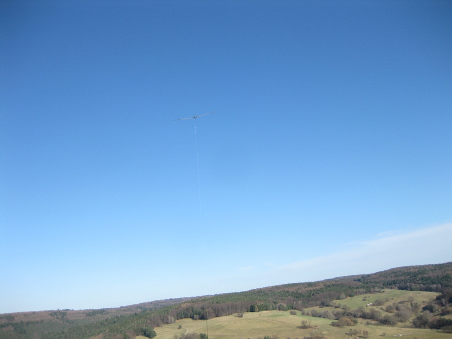 Zuerst Flitsche aufgebauen, ich hatte Gestern 2 Haken im Abstand von 60 mm eingebaut, 50 mm vor dem Schwerpunkt. Damit komme ich mit dem V-Seil an der vorderen Kufe vorbei und der Start ist eine Mischung aus Hochstart und Flitschen. Viel weiter dürfen die Haken nicht auseinander sein denn sie dürfen das Rollen nicht behindern sonst giert die Horten bei einer Böe unkontrolierbar bis zum Abriß am Seil.