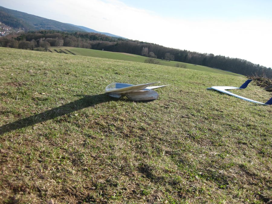 Bei den ersten beiden Flügen bin ich noch ohne die gesplitteten Ruder mit konventioneller Mischung geflogen, aber ich hab dafür die Wölbklappen und die Sörklappen getestet.