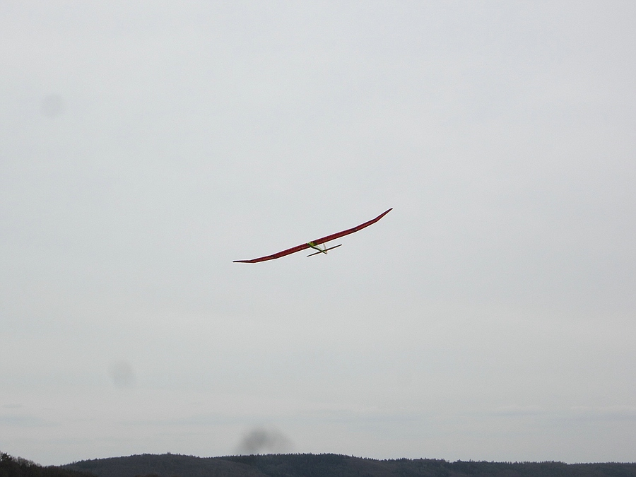 Der mit FLZ-Vortex ermittelte Schwerpunkt von 92 mm für ein Stabilitätsmaß von 13 % hat für die heutigen Verhältnisse mit ~ 3 Bft am flachen und baumbestandenen Hang sehr gut gepaßt. Tobi meinte bei ruhigerem Wetter kann noch ein bisschen Blei aus der Nase, aber das liegt voll im Bereich der Pilotengewohnheiten. Hochstart haben wir noch nicht probiert, es ist auch noch kein Haken drin gewesen.