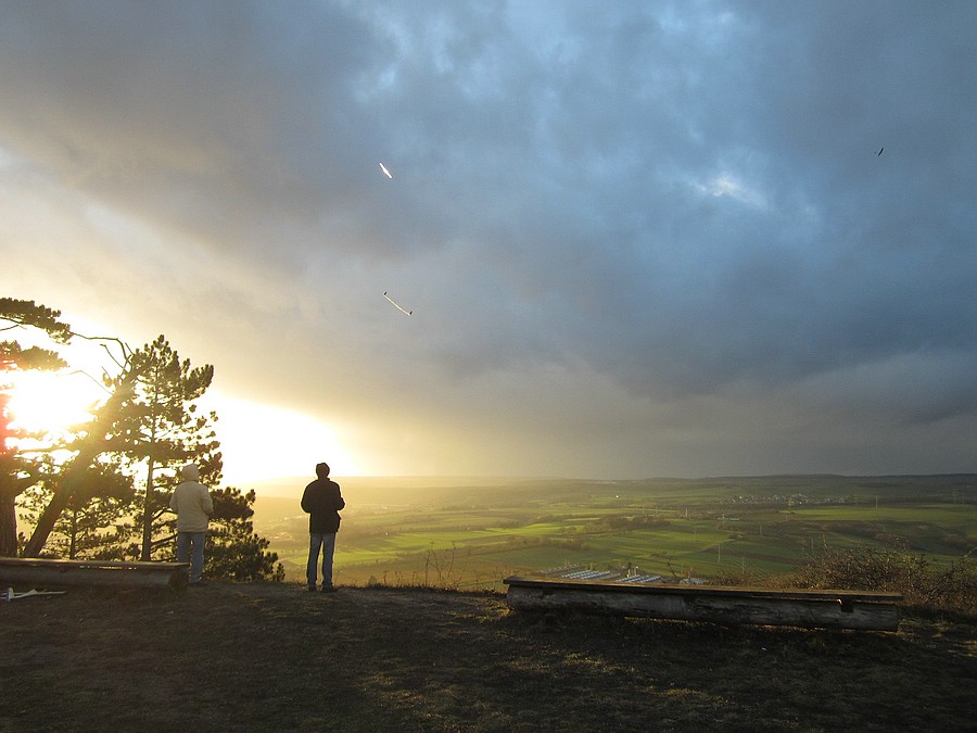 Für das Schauer(liche)-Wetter war am Felsen erstaunlich viel los, ein paar schnelle DS Runden waren drin, aber wegen öfter drehendem Wind war es nicht konstant. Dennis hatte tolle Reaktion und riesen Glück als seinen Valenta-Macchiato in der unteren Wende eine Querböe erwischte und in Sekundenbruchteilen bei ~ 150 km/h die 5 m Höhe auf fast Null reduzierte. Im überzogenen Trudelflug hat ein Busch das Modell relativ sanft aufgefangen und neben ein paar kleinen Macken nur den Höhenleitwerksverbinder geknackt. Das war aber der einzige Bruch des Tages, vor der Kante ging es immer schön rauf und das wechselhafte Wetter sorgte für spektakuläre Lichtstimmungen :)