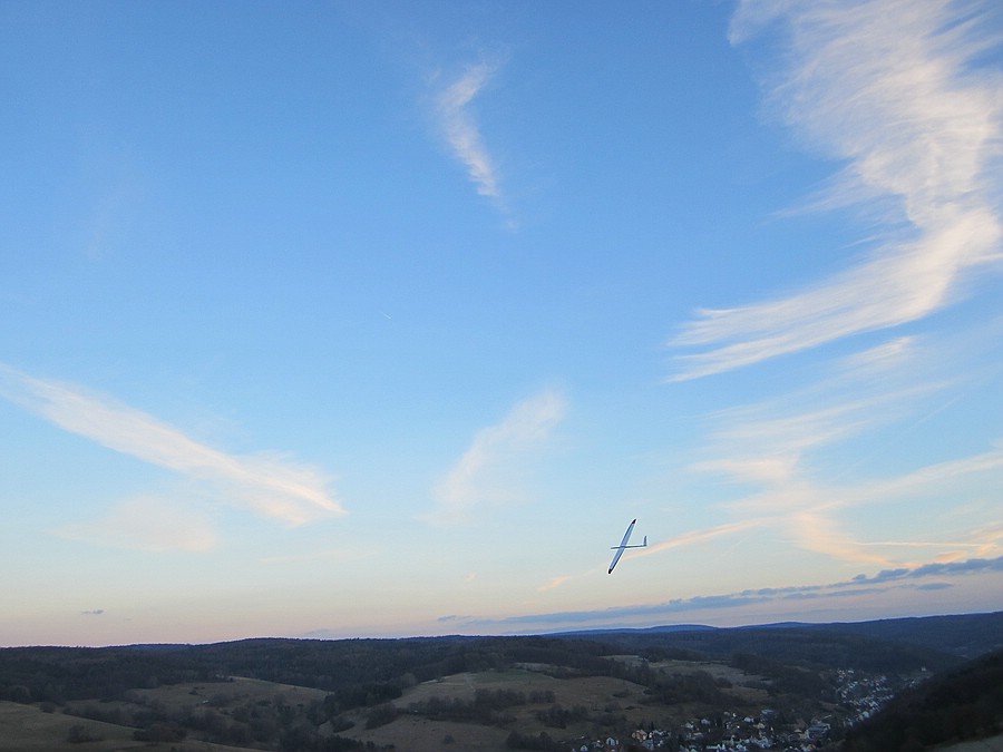 Heute war für mich Saisonauftakt 2013, bei Sonnenschein blauem Himmel und leichter aber größtenteils sehr gleichmässiger Winterthermik. Es hat sich fast angefühlt, wie im Sommer das Ausfliegen der Abendthermik, nur die Temperaturen haben nicht dazu gepasst! Es war nämlich ziemlich "zapfig" :D . War ein sehr entspannendes, ruhiges Fliegen. Nach ungefähr 1,5 Std und etwa 45 min Flugzeit bin ich ein wenig durchgefrohren, aber sehr zufrieden nach Hause gefahren. Wenn das ein Omen für die Saison 2013 war: Mehr davon! :) :) Jetzt bin ich doch froh, dass Uwe noch ein paar Bilder eingestellt hat, da ich ( mal wieder )meine Kamera zu Hause gelassen hatte :oops: .