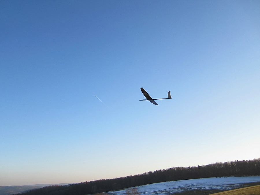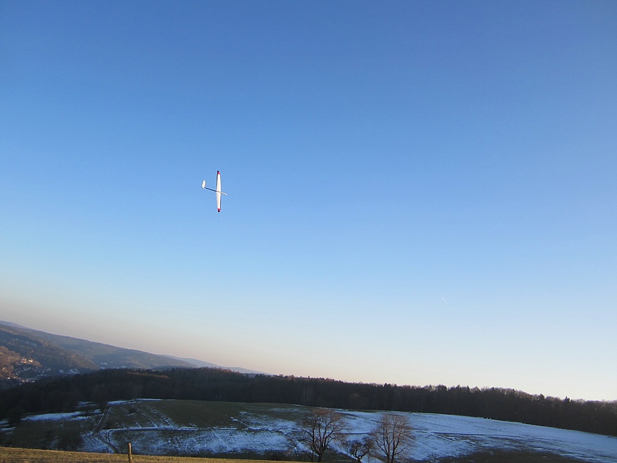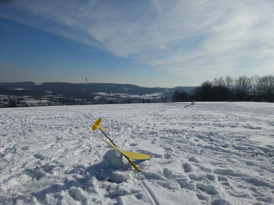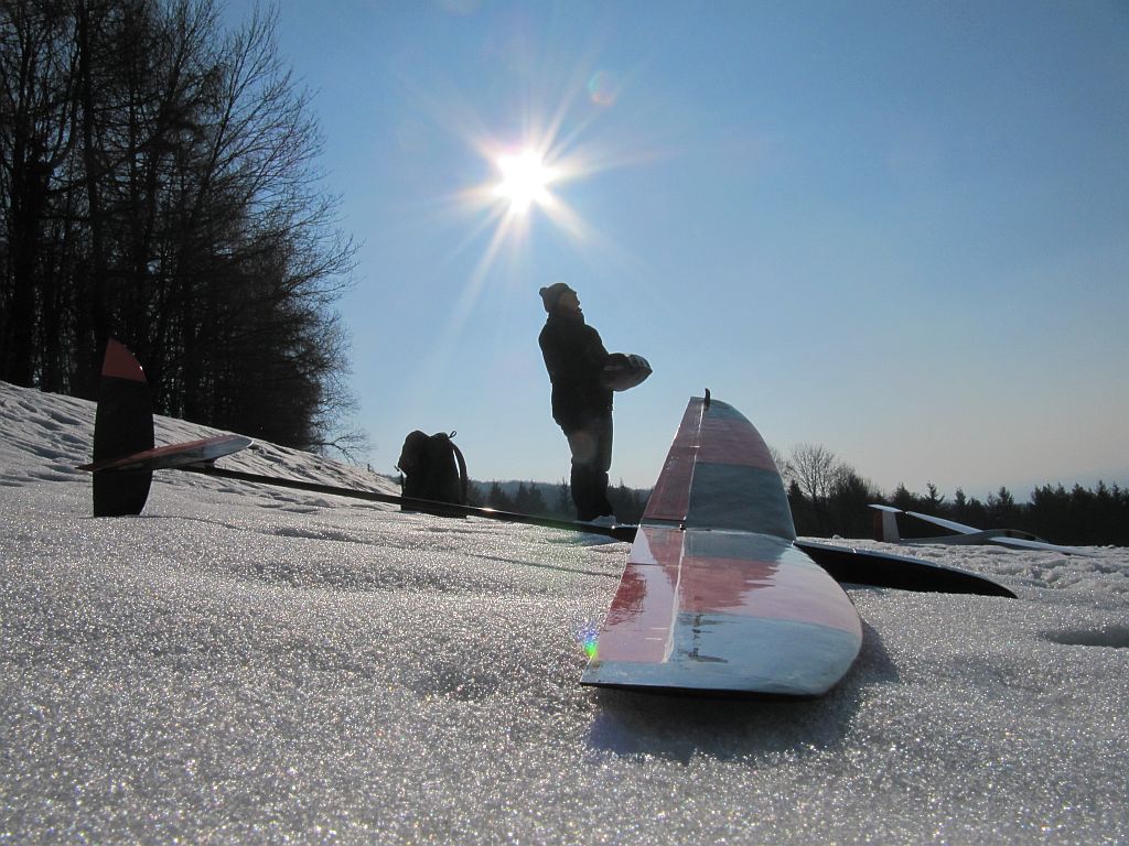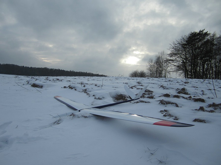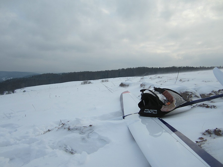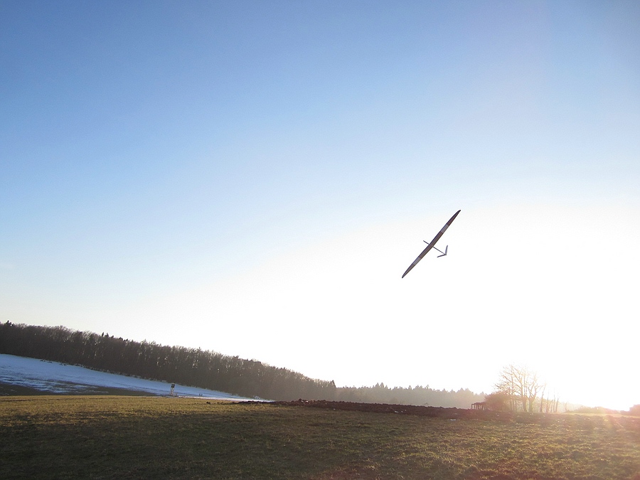 Heute hat das Autothermometer -4° angezeigt und der Wind war deutlich kräftiger, kein Wunder dass ich alleine an meinem Ost-Haushang war, ich habs auch nur ein Stündchen ausgehalten bevor der Drang zu Heißgetränken übermächtig wurde. Das Tragen war für die fehlende Sonneneinstrahlung überraschend differenziert, bei starkem Wind wurde es einfach nur bockig, bei nachlassendem Wind gings rauf oder es war schnelles und enges fliegen in Bodennähe möglich. Trotz der Kälte hab ich ein paar Videosequenzen vom Shooter gemacht, incl unbeabsichtigtem touch-and-go-Start. Ich versuch mal was kurzweiliges zusammen zu schneiden, bis da hin erstmal die Bodenbilder: