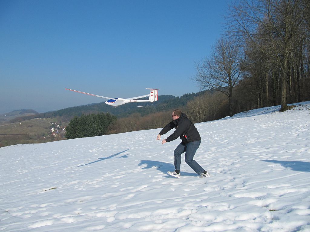 Heute bei uns am Hang: Sonne pur, kaum Wind, der aber aus der richtigen Richtung und schönste Frühjahrsthermik ohne Ende. Insgesamt knapp 2std. Flugzeit und Eisfüße.