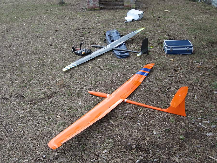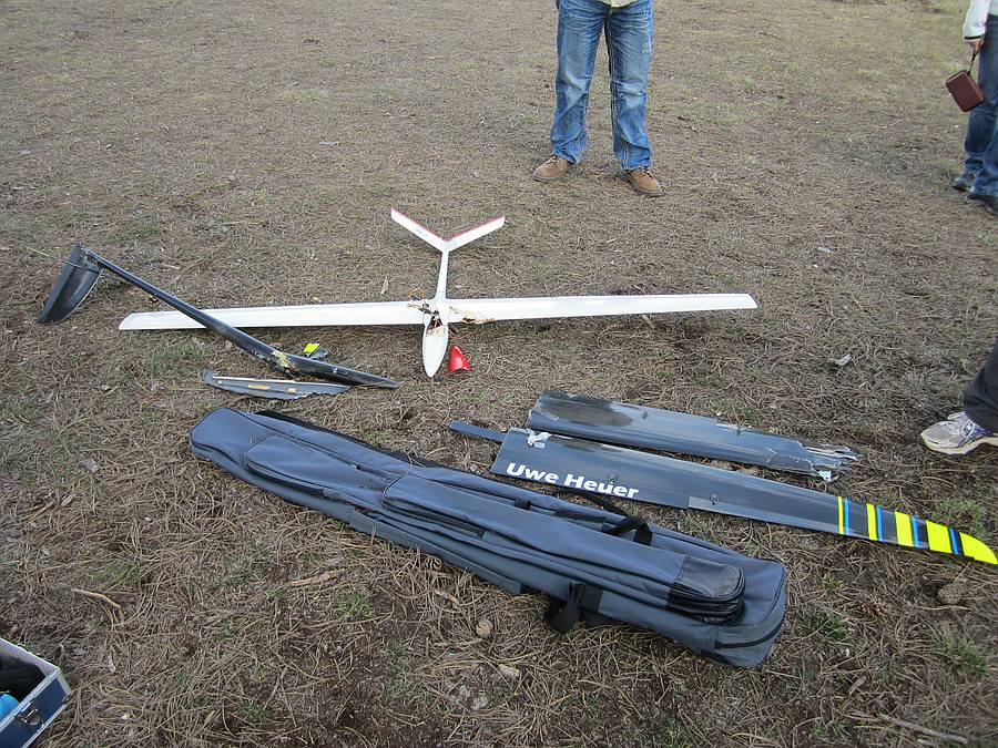 Leider hatten sich der ältere, aber bisher ungeflogene Flieger von Italouwe und mein Pace ziemlich gerne und ein Zusammenstoß vorm Hang hat mein schwarzer Leitwerker nicht überlebt. Es war ein ärgerlicher, aber gewöhnlicher Flugunfall weil sich mein Vorbeiflug parallel zum Hang und Uwes Queranflug zur Landung in etwa 150 m Entfernung bei flotterer Geschwindigkeit beider Modelle gekreuzt haben. Wir haben den drohenden Crash beide zu spät gesehen um noch auszuweichen, aber sowas passiert beim Hangflug halt ab und zu :?