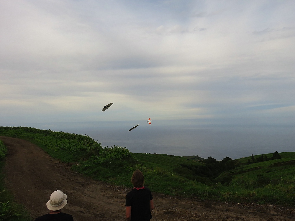 Die neue Windrichtung mit der Caldera in Wolken hat Schwierigkeiten gemacht einen passenden Hang zu finden, aber nach etwas Suche und ein paar getesteten Startstellen waren wir mit einer knapp 270 m hohen Kante mit fast fußballplatzgroßer, kurz gemähter Landewiese sehr zufrieden. Die Kulisse war wieder grandios, der Regen hat uns für den Rest des Tages in Ruhe gelassen und wir hatten viel Spaß bei einem tollen Hangflugtag mitten im Atlantik