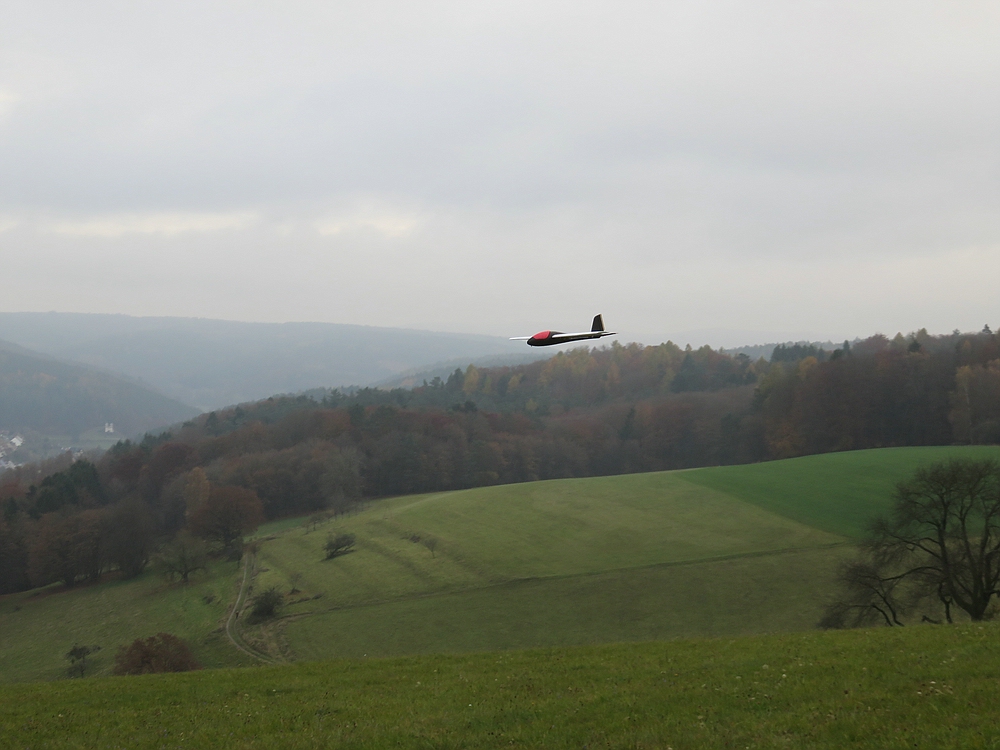 Heute trübes Herbstwetter und 1-3 bft am Osthang, aber ab und zu lugte die Sonne durch die niedrigen Wolken und es hatte zeitweise sehr brauchbare Thermik. Die +8° sorgten bei guter Thermik für kalte Finger, das nächste Mal nehme ich den Windschutz mit, es wird jetzt immer winterlicher.