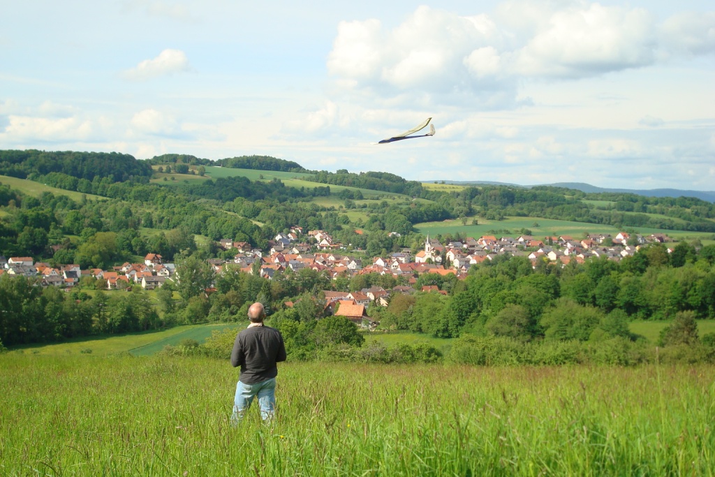Nach anfänglich üblen Bedingungen mit mehreren Absaufern bei denen ich den Flieger von ziemlich weit unten holen mußte, gings dann an einem anderen Hängchen erheblich besser und ich konnte mehrere schöne Thermikflüge aus dem Handstart machen.