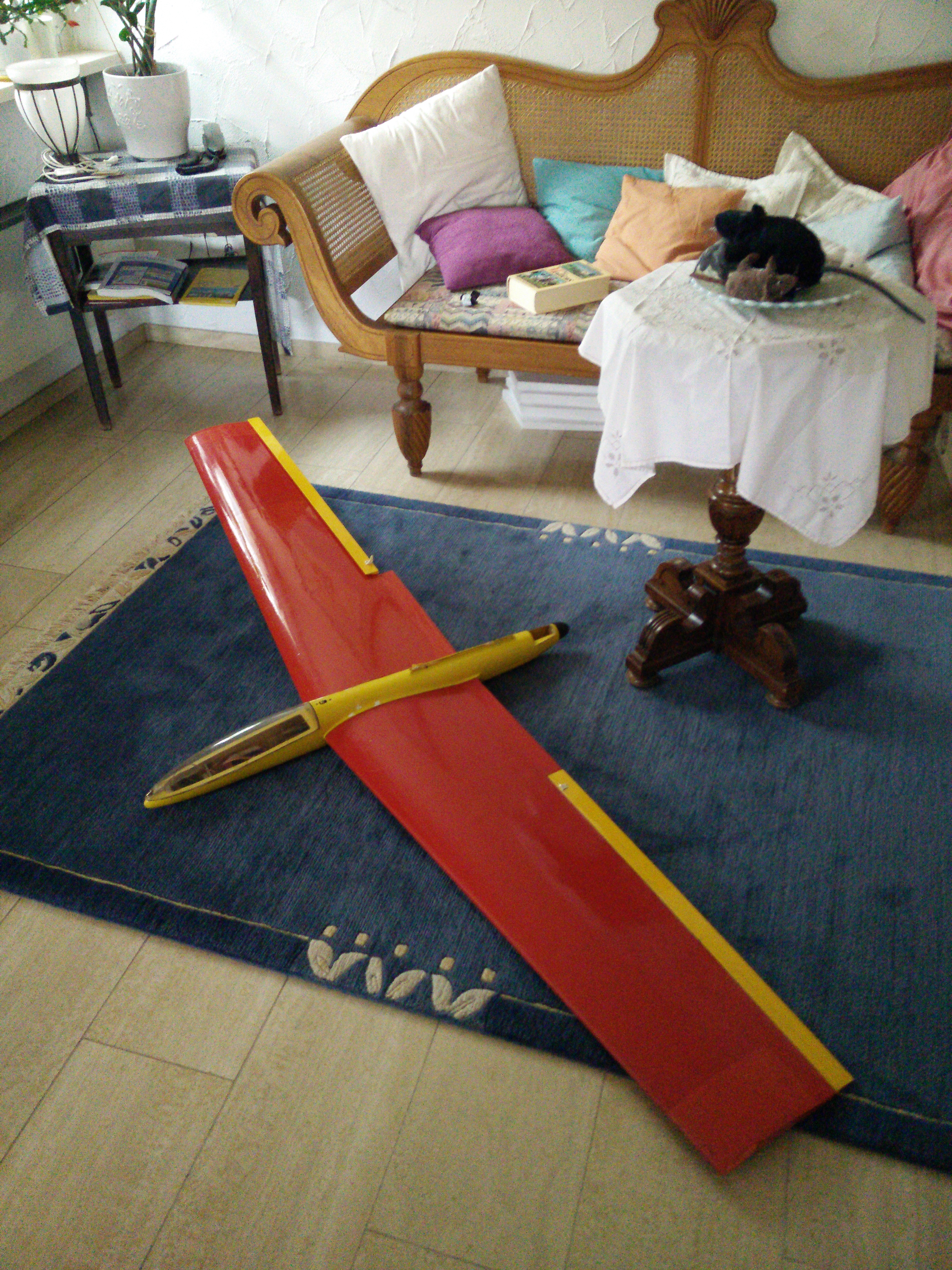 Mal schauen … wenn ich das nächste mal irgendwo Servos übrig hab reinwerfen und mal sehen ob das Kistchen noch fliegt. Süß isser ja :-). Wie’s ausschaut war die Finne einfach Balsa, wird also auch wieder einfach nach Peter-Wicks schönem „Brettnurflügel-Spickzettel“ dimensioniert draufgepappt, denke ich mal.