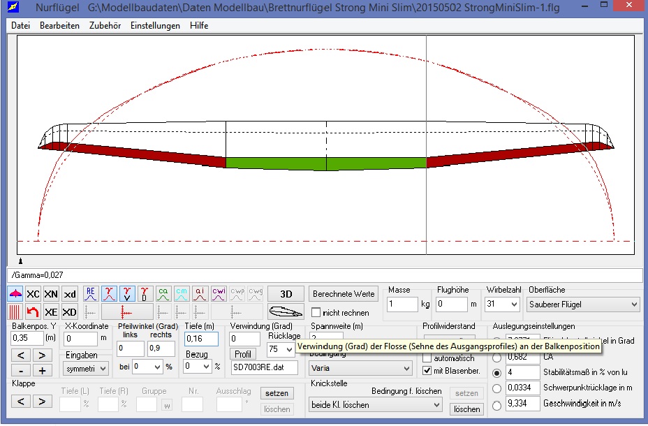 Unten auch noch ein Screenshot von während der Auslegung mit 2 m Spannweite, die Profile hatte ich danach noch auf Re-Zahl und Auftriebsbelastung an der Einbaustelle angepaßt.