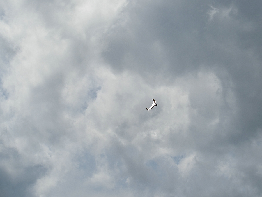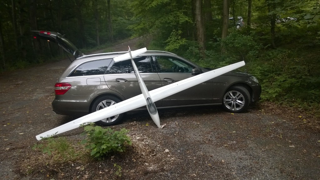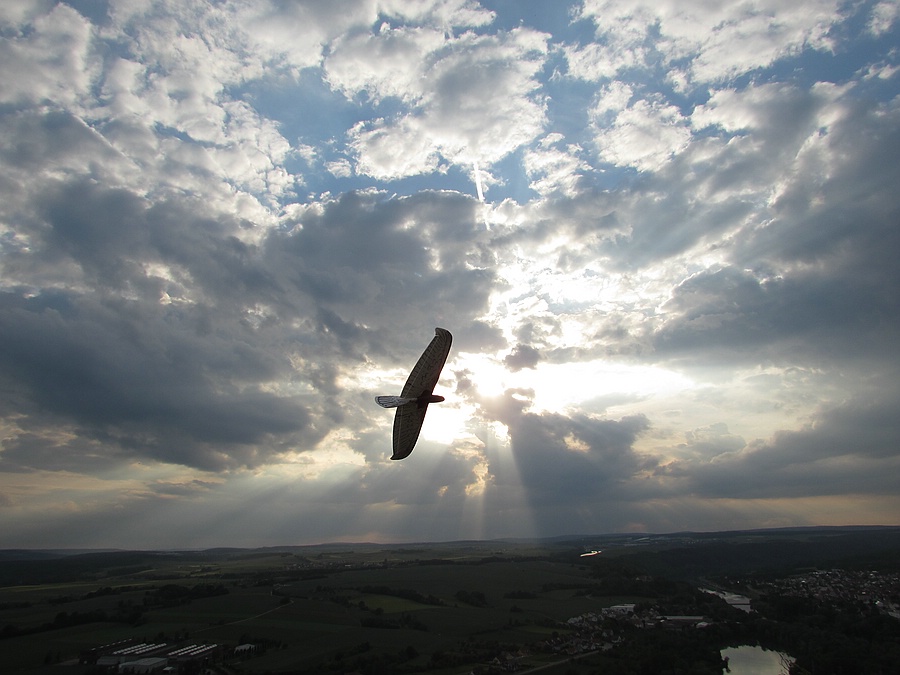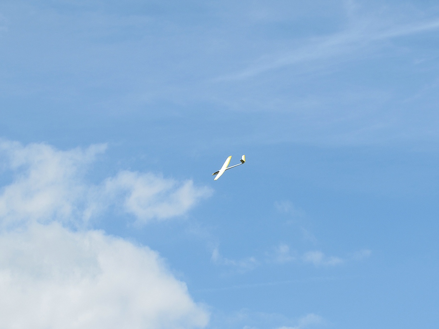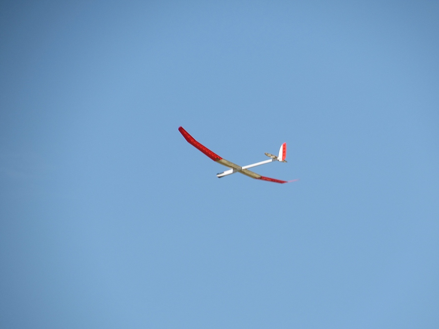Also gedacht … Peter hat doch was von vollgasfest gesagt, oder? Auf die Nase mit der Kiste und von hinten ins Tal. Geil! Die Pfeifft und jammert so richtig! Bei -25m dann beherzt Höhe und Quer, und mit leichtem Flügeldurchbiegen senkrecht in den Himmel rollen. Leider war dann bei ~+30m die Energie schon wieder weg, aber für 900g und (fast) ohne Verstärkungsfaser ist das doch beachtlich!