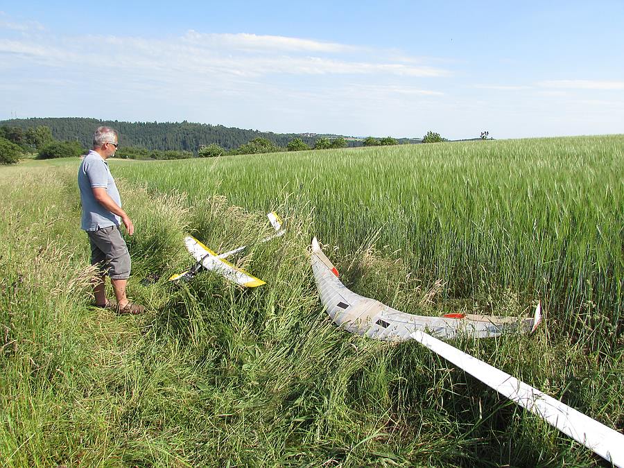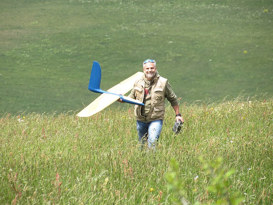 Heute war ich noch mal mit dem Salto am Hang, die Bedingungen waren erheblich besser als Gestern und ich konnte ein bisschen mehr rumturnen und die Rudereinstellungen erfliegen. Besondere Schwierigkeiten hat es gemacht die Einstellungen für Querruder hoch als Landehilfe zu finden, ich habe tatsächlich 2 Flüge gebraucht bis es halbwegs gepaßt hat und selbst dann musste ich durch die Leewirbel noch Höhenruder nachsteuern :shock: :shock: ...was dabei passiert ist halt doch nicht vorhersehbar und ruck zuck steckt der Flieger im Dreck.....puuuhh, der Salto hat diese hochkomplizierte rumpropirische Einstellerei ohne einen Kratzer überlebt, Glück gehabt :mrgreen: