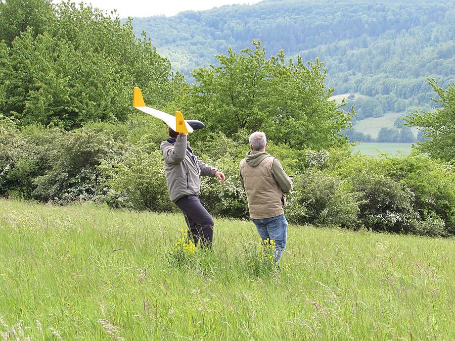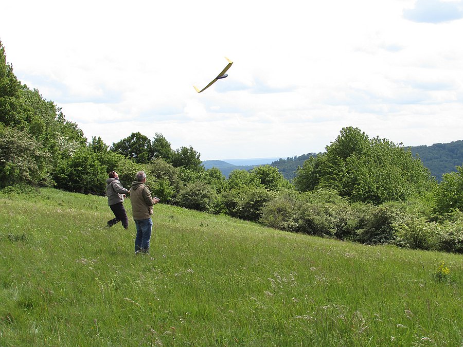 Heute wenig los am Spessartsegler-Vereinshang, Wind meist von hinten, aber Elmar hat geflitscht und ich für die ersten Flüge mit dem neuen Energic mangels Flitschenhaken versucht in die Thermik zu werfen. Ein paar schöne Flüge waren damit aber möglich und die Einstellungen des Energic müssten weitestgehend passen, wie es scheint braucht man mit grünen Fliegern weder Antrieb noch Wind von vorne :P :mrgreen: