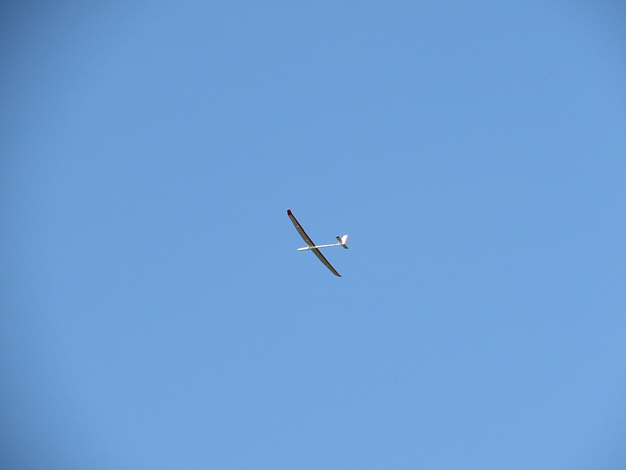 Gestern konnte ich am Abend den ersten längeren Flug mit dem kleinen 2,5 m Baudis- Salto machen. Bei gut Wind, aber verhältnismäßig schwachem Tragen eine halbe Stunde immer wieder mühsam hoch kämpfen und mit ein paar kleinen Turneinlagen abfliegen. Der Durchzug mit dem geringen Gewicht ist gering, der Abriß beim zu langsamen Kreisen kommt plötzlich, aber das Flugbild ist Klasse.
