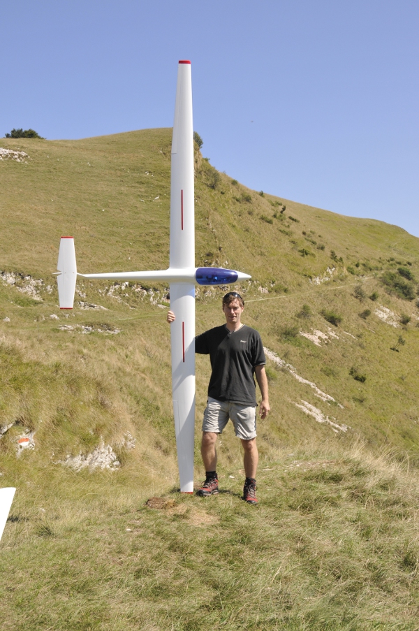 Ich bezeichne das als " Alltags - F3J ", weil es ein thermik - orientiertes Modell mit etwa F3J Abmaßen ist. Im Gegensatz zum Wettbewerbs - Modell, die ja in kompletter Vollschalenbauweise gefertigt sind, und bei gleicher Größe nur etwa die Hälfte wiegen, ist mein Eigenbau zwar mit einem CFK/ Kevlar/ Glas - Rumpf ausgestattet, Fläche und Höhenleitwerk allerdings in Styro/Furnier - Bauweise gefertigt. Er ist dadurch um einiges robuster, als die Wettbewerbsmaschinen,eben alltagstauglicher ... vor allem beim Bodenhandling; aber das wird natürlich mit dem höheren Gewicht erkauft.