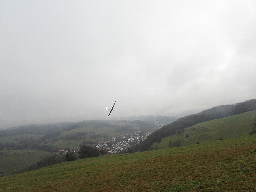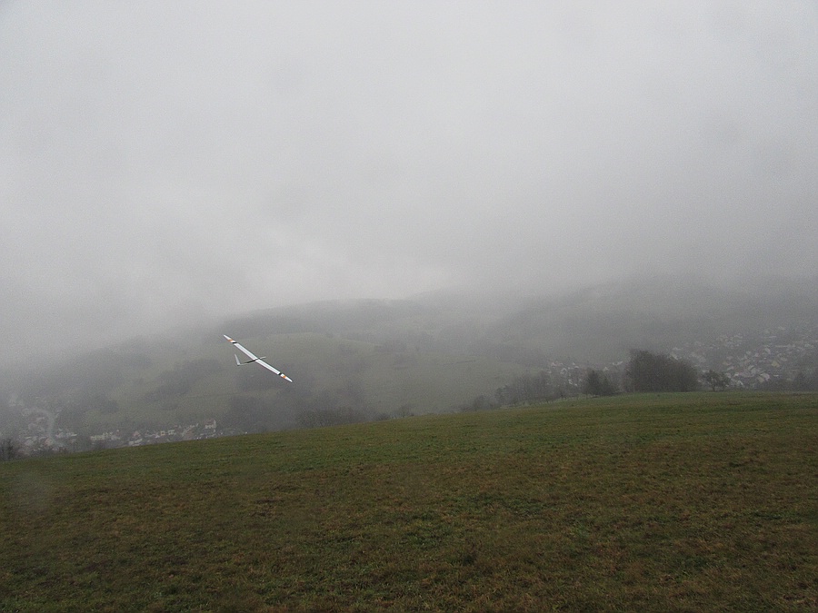 Hallo Leute, heute +0,5°, eisiger Regen, Nebel und 1-2 Bft schräg zum Hang, also beste Vorraussetzungen um meinen neuen Maulwurfhaufen-Such-Besenstiel einzufliegen.