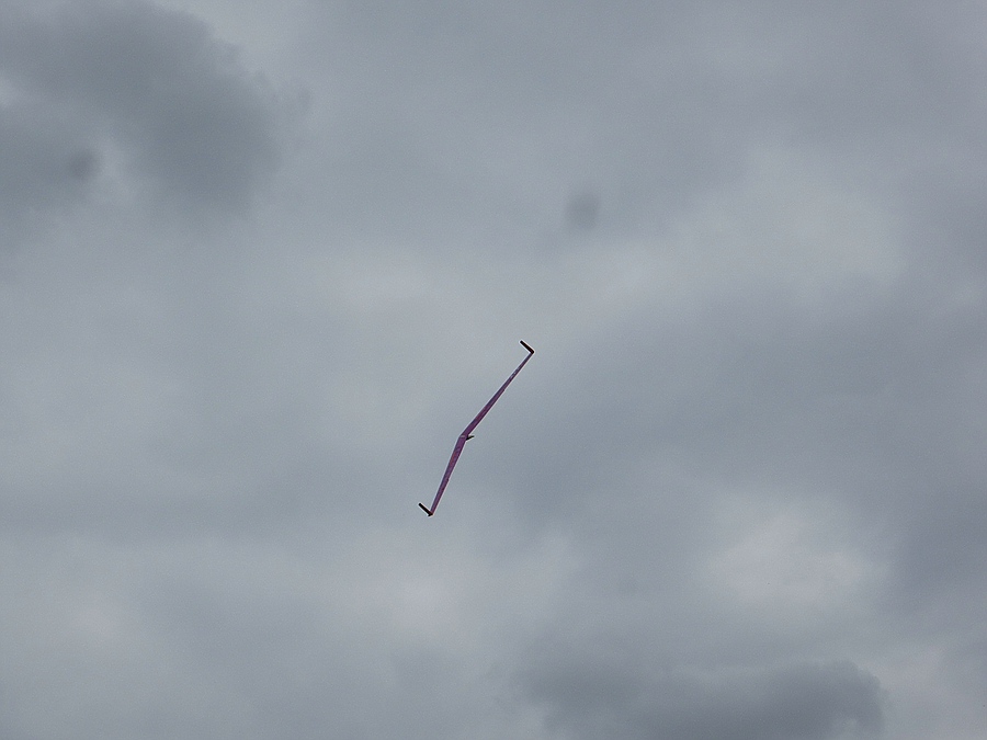 Ich habe dann mit bewußtem Überziehen in der oberen Steigphase Ausbrecher provoziert, die sich immer mit Höhenruder nachlassen und Gegenquerruder einfangen ließen. Bei einem Start kam zufällig eine Böe direkt von vorne, dabei habe ich sogar ein bisschen am Seil pendeln können.