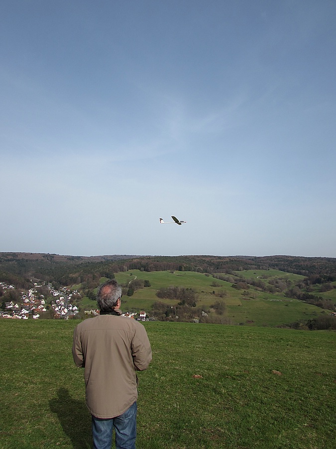 Heute sehr schwacher NW-Wind und damit Thermikfliegen am Felsen mit dem SSL. Der erste Flug war ganz schön bis 150 m rauf, der zweite Flug war dann nicht mehr so schön bis 110 m runter :roll: ....aber durch das sonnige Wetter sah ich den Schatten des Modells im Tal, das erleichterte die Außenlandung sehr ;-)