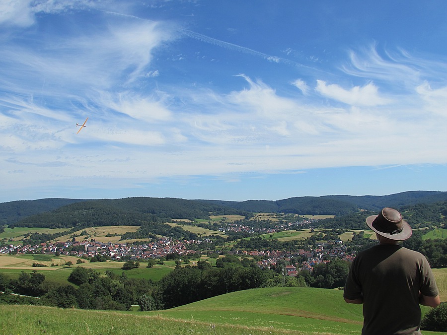 Das habe ich drei mal gemacht und maximal ca. 20 m Überhöhung erflogen, aber richtig weg kam ich nicht und einen "Hausbart" konnte ich auch nicht lokalisieren. Die Vorflüge übers Tal brachten auch keinen Erfolg und der SSL musste sich mit den kleinen Aufwindfeldern über der Waldschneise wieder zurück hangeln um sicher zu landen.