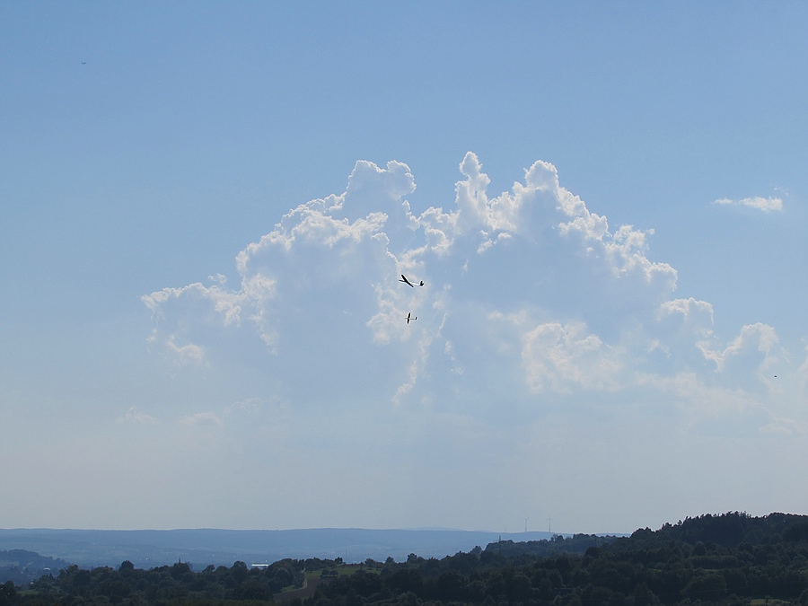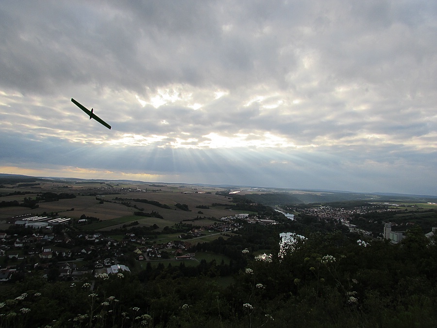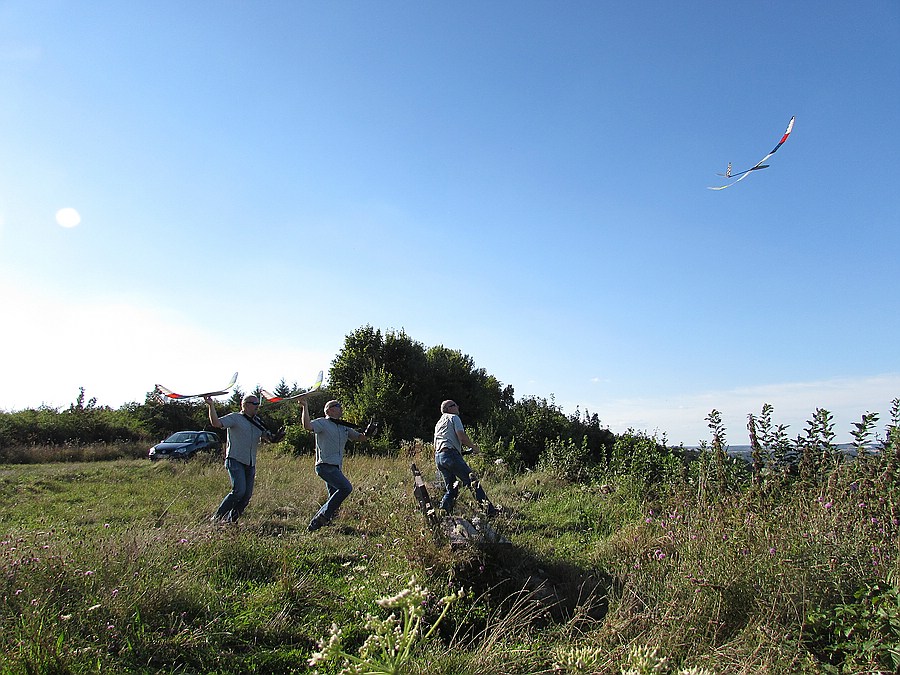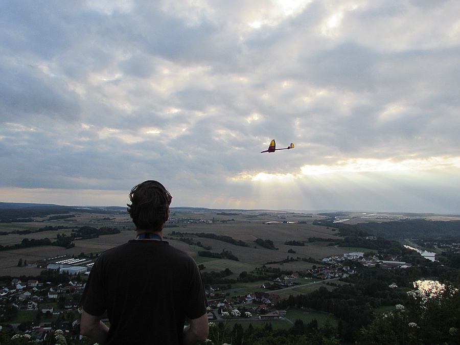 Die Waldlichtung ist im Vergleich zur Gleitschirmfliegerschneise mehr nach Westen ausgerichtet und hat für Shooter und Minirock besser getragen, aber es trug vor allem thermisch. Ich hab noch 2 Stunden lang einige schöne Flüge gemacht und bin immer freiwillig gelandet, nicht weil es keinen Aufwind mehr hatte. Dabei waren ein mal 5 Bussarde lange im selben Bart wie der Shooter und der Minirock hat in einem Pulk Schwalben seine Thermikflugqualitäten gezeigt, auch ein Bussard konnte ihn nicht abhängen nachdem ich noch mal Blei aus der Nase genommen hatte, das Grinsen davon hab ich immer noch im Gesicht