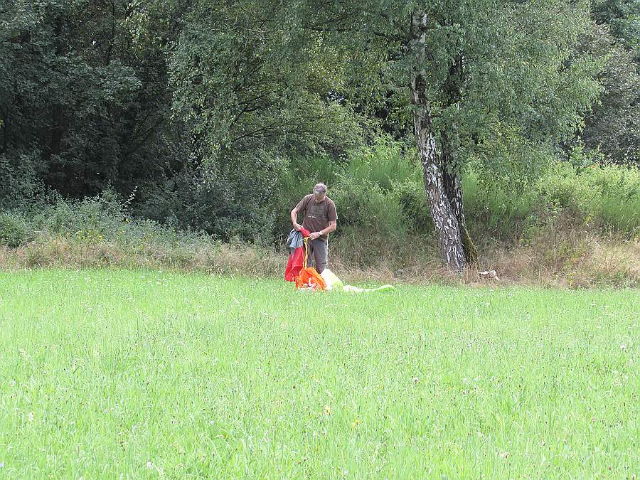Ich bin einfach nach Osten zur nächsten Kuppe an meine Waldlichtung gefahren, aber da kann der Gleitschirm mangels Waldschneise nicht starten, der wollte nach Westen zu einer anderen Gleitschirm-Startstelle.