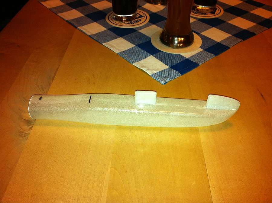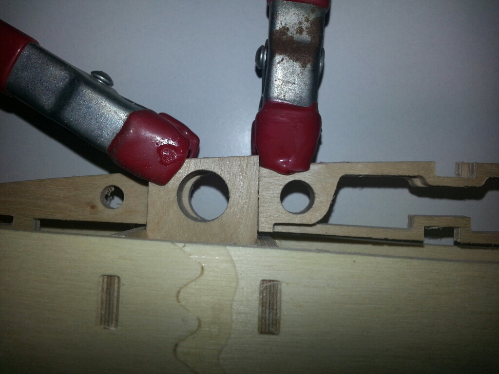 Bei der Rippe 0 genügt es zunächst wenn die hinten mit der Fußaufdopplung fest in der Helling klemmt, das Steckungsrohr läßt sich leichter einfädeln wenn die Rippe nicht ganz starr in der Helling geklemmt ist. Zum verkleben der Holme dann die Rippe so ausrichten, dass sie an der Randbogenseite des Hellingausschnitts anliegt.