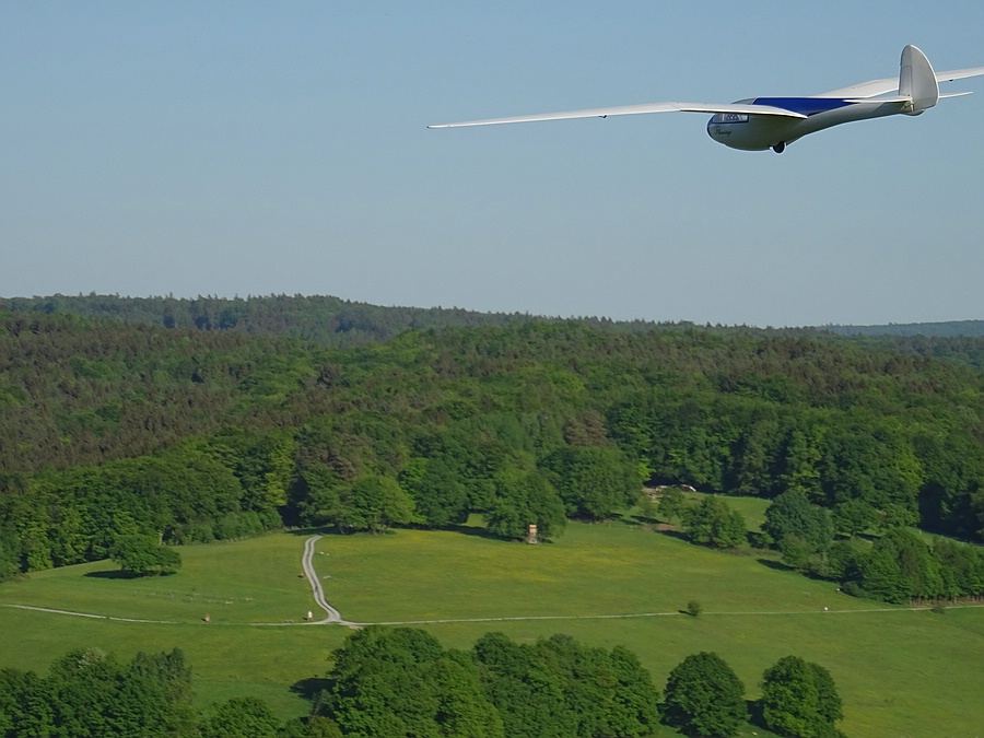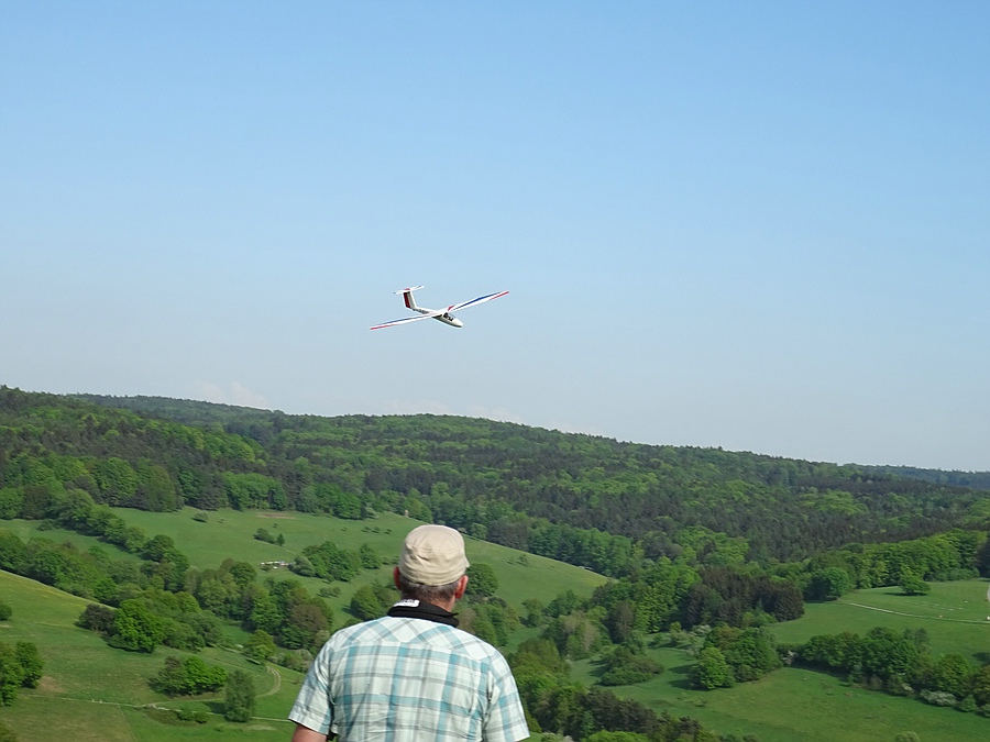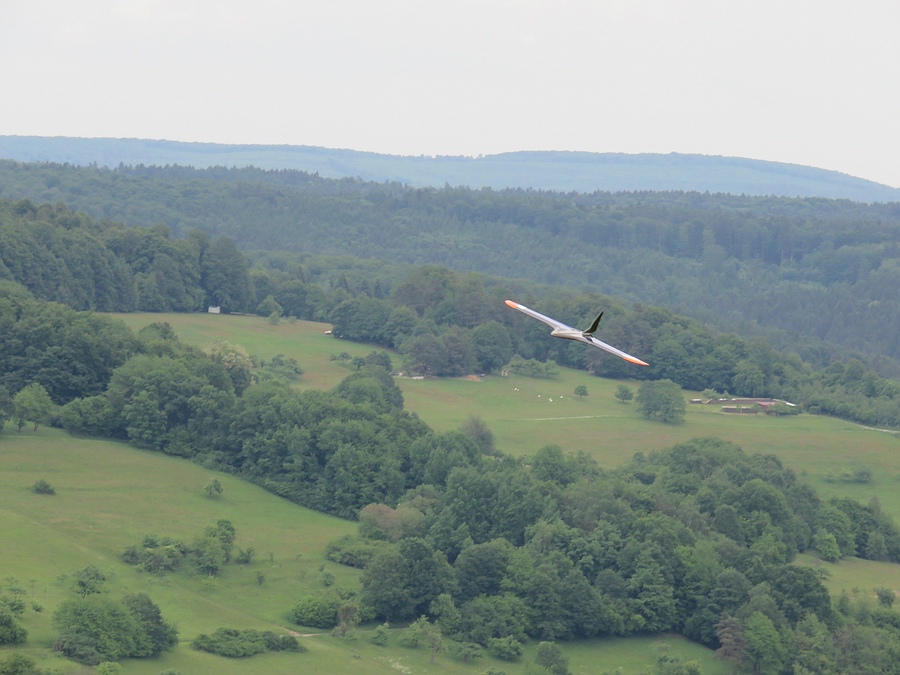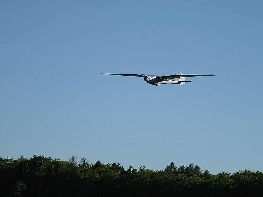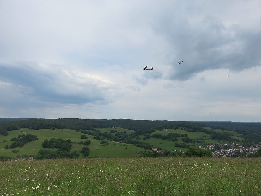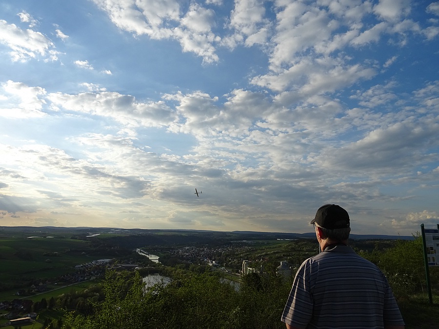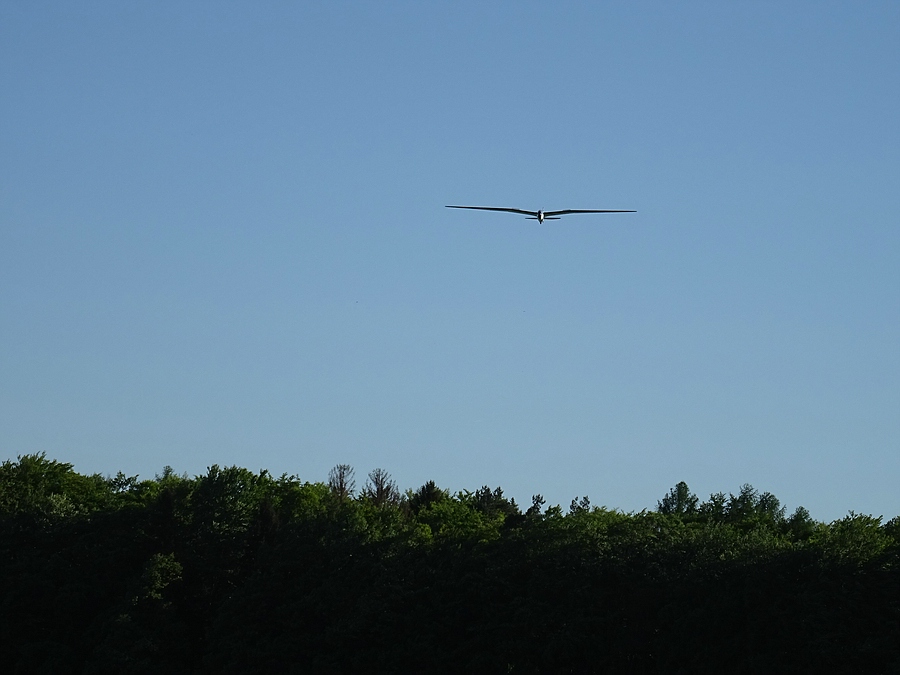 Zunächst kam die personentragende DG 1000 "Schloß Johannisburg" übern Pfaffenberg und dann kam tatsächlich eine Phase von etwa 20 Minuten mit schwachen Abendthermik-Ablösungen, die aber für meinen Shooter reichte um das Spessartsegler-Pflichtprogramm und ein bisschen mehr zu fliegen