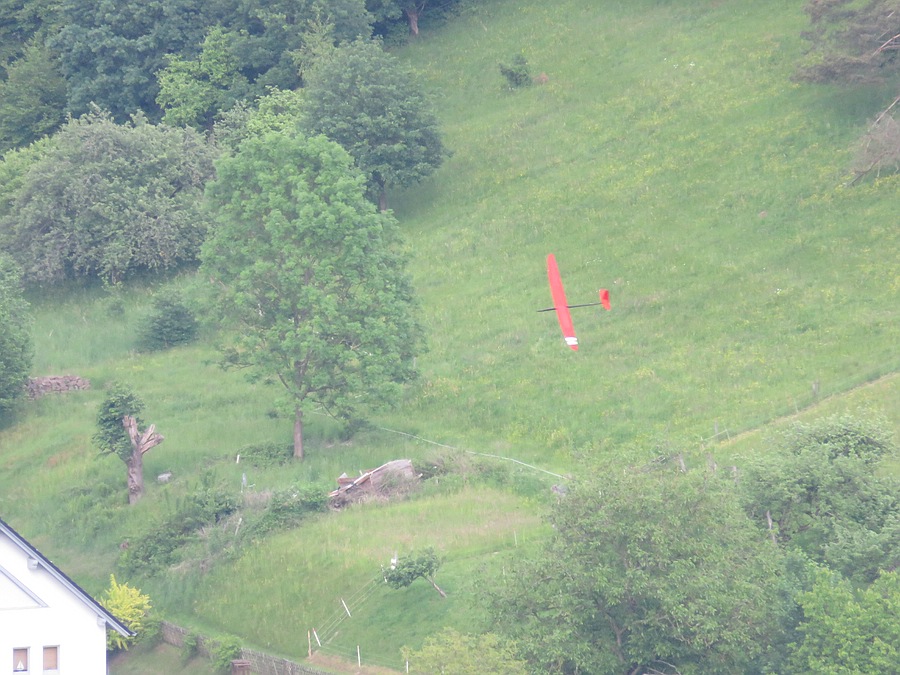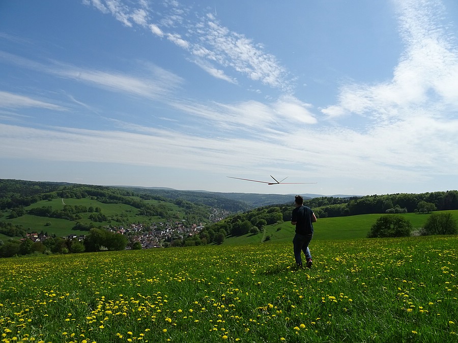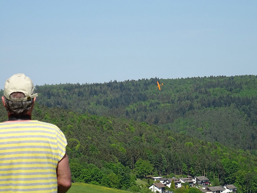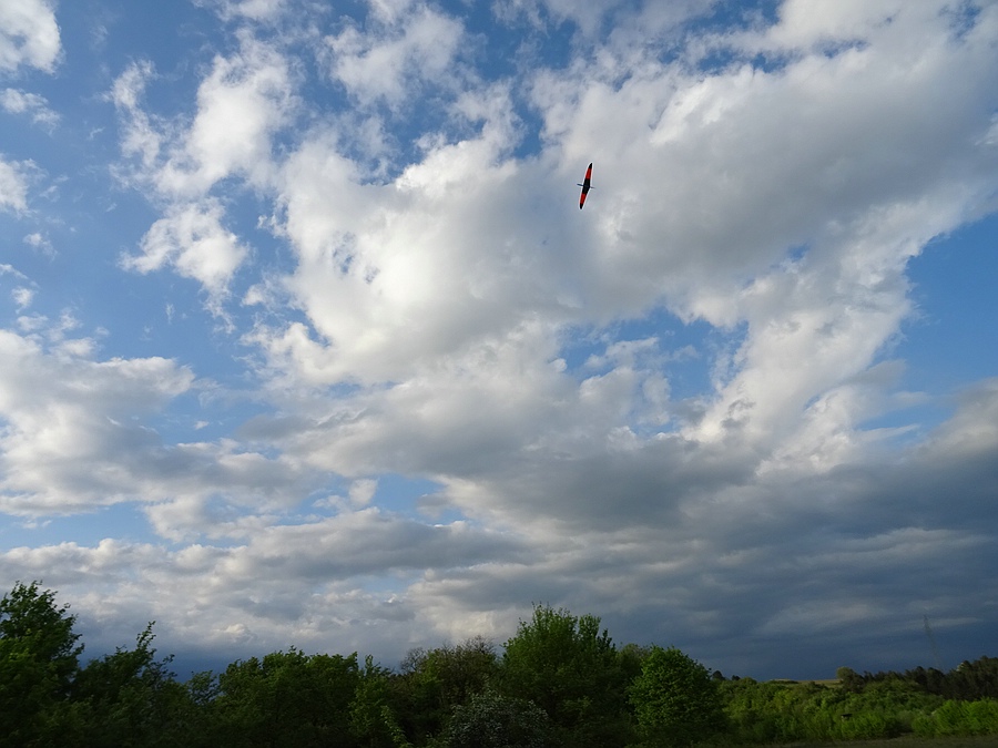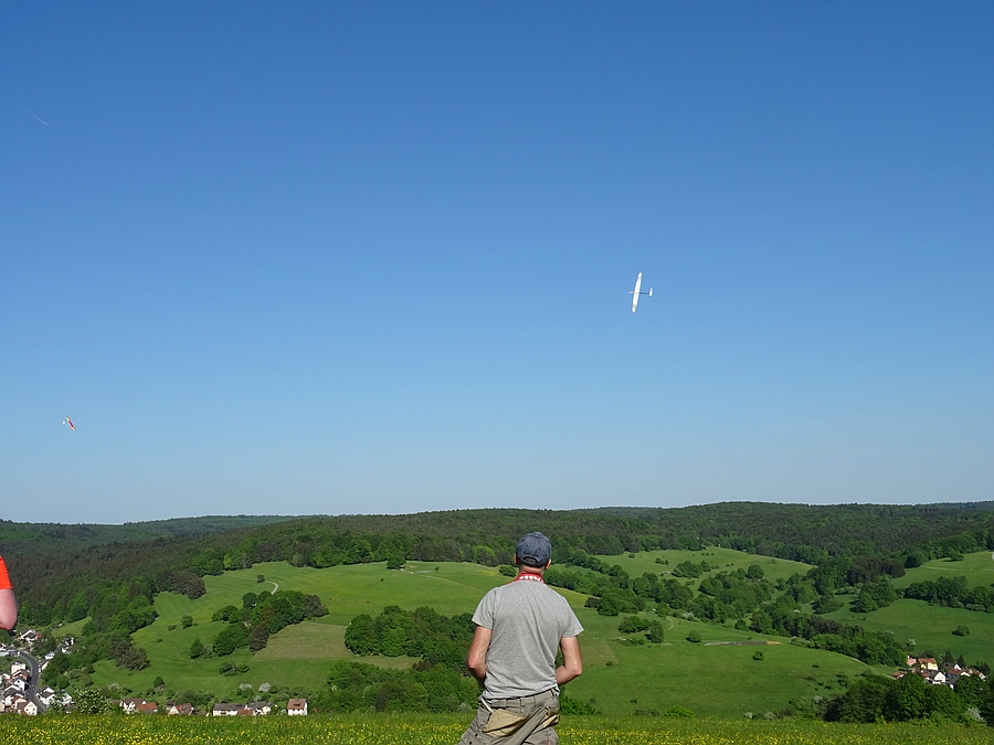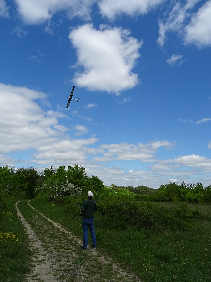 Dann heute also lieber fliegen....die Bedingungen waren Anfangs sehr unterschiedlich, neben guten Tragen gab es heftiges Saufen, aber im Laufe des Nachmittags wurde das Tragen immer gleichmäßiger und das Saufen immer seltener. Auch ein paar DS-Runden hinter den linken Bäumen konnte ich testweise drehen. Ein schöner Flugnachmittag mit den netten Kollegen, so kann das lange Wochenende weiter gehen