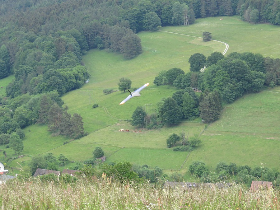 Heute anspruchsvolle Bedingungen am Osthang im Spessart bei 1-2 bft, erst nix Aufwind, dann zeitweise gutes Tragen, aber auch heftige Absaufer, man musste schon aufpassen wo man hin fliegt um lange oben zu bleiben.