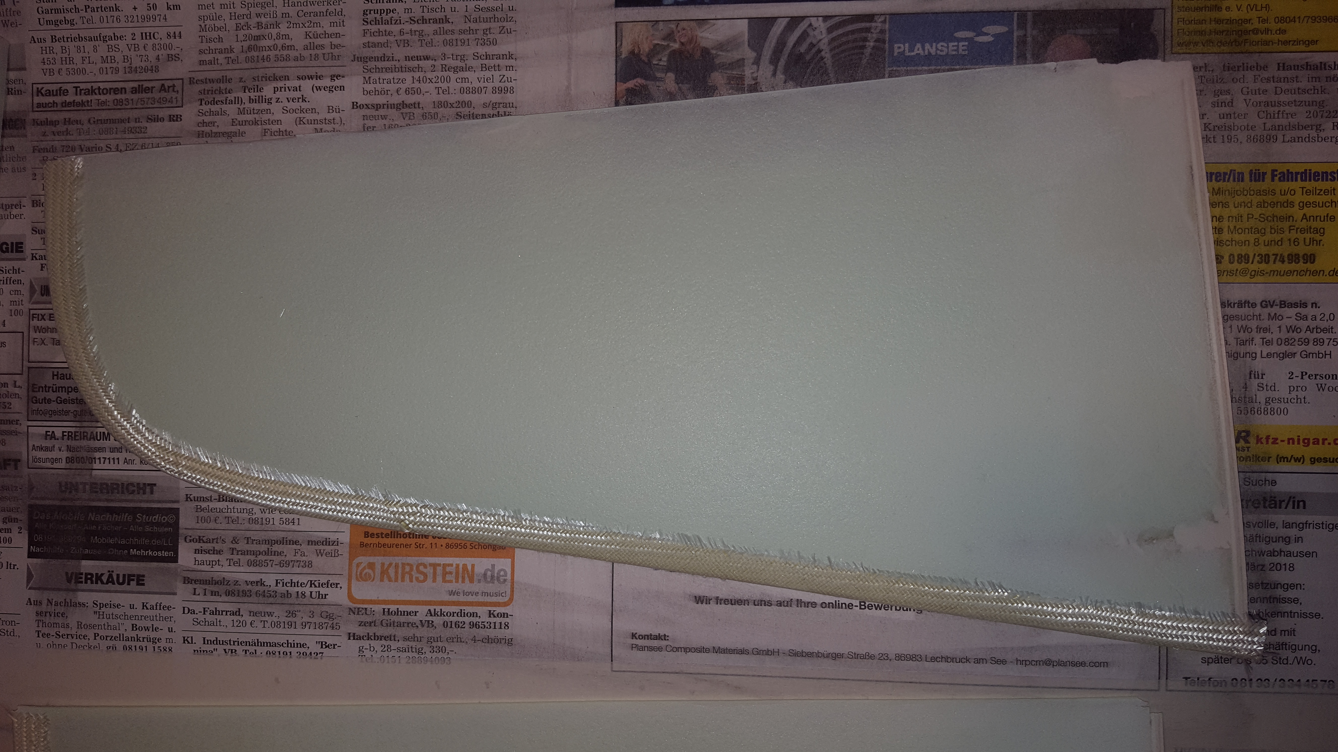 Nach dem Aushärten werden die Mylars abgezogen. Ich war vom Ergebnis begeistert. Einzig am Randbogen hat sich beim hineinschieben in den Vakuumsack das Glasgewebe etwas gelöst.