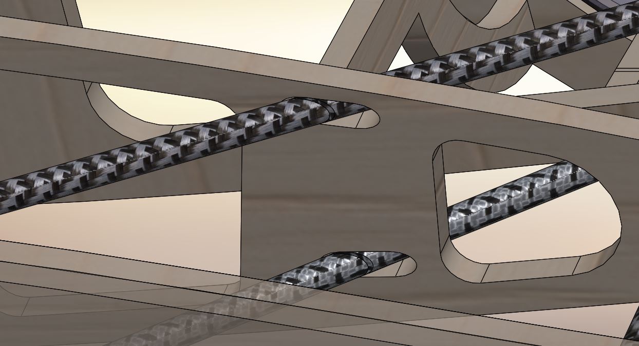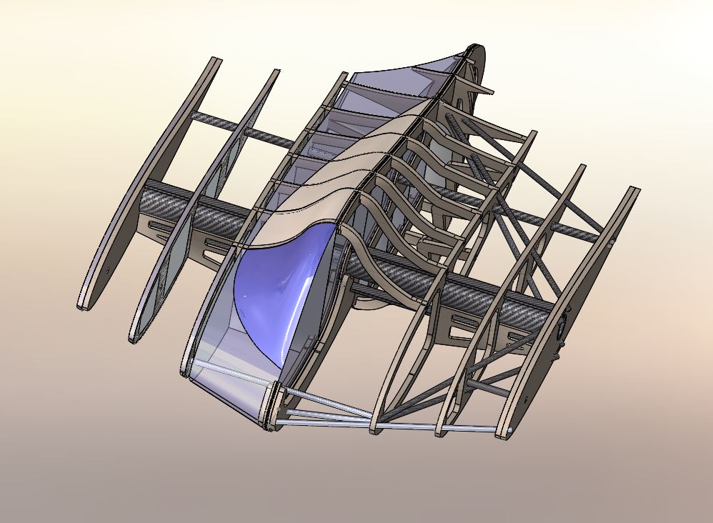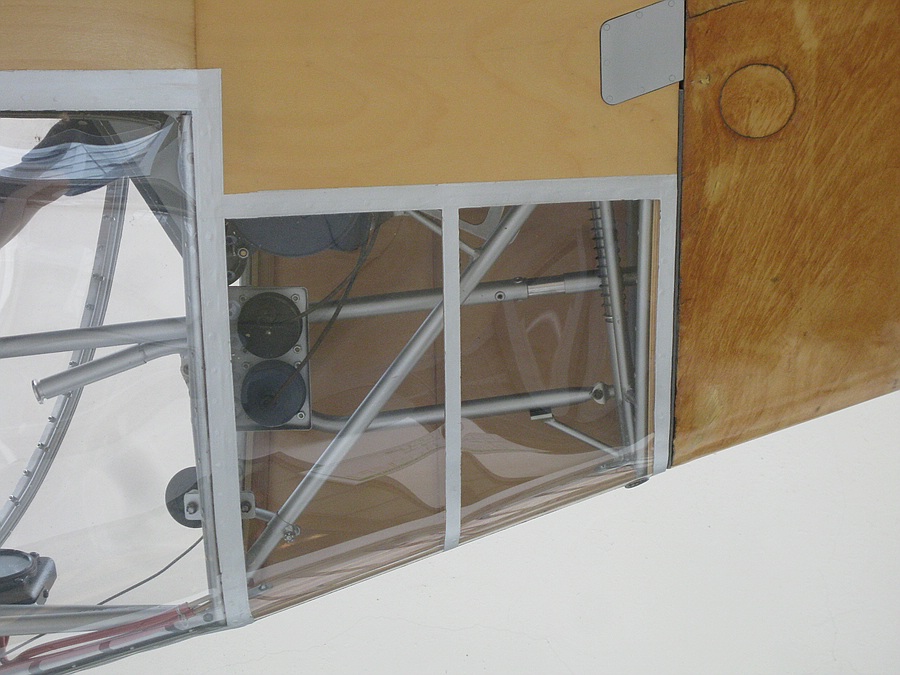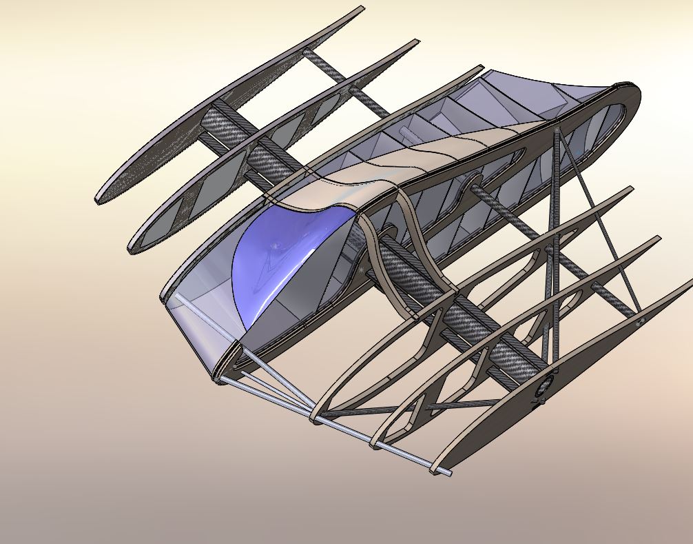 Das System ist etwas komplizierter als eine einfache A-Struktur, wegen der Unterbrechung des Holmverlaufs durch das Cockpit müssen die Kräfte aber ein paar Umwege gehen um aufgenommen werden zu können. Beim Modell kann man noch ein paar Nullstäbe einfügen um die Längen der Tragbalken zu verkürzen, denn unter der Haube muss ja kein Pilot untergebracht werden bzw. kann man die Puppe etwas mehr verformen als es einem lebenden Piloten angenehm wäre.