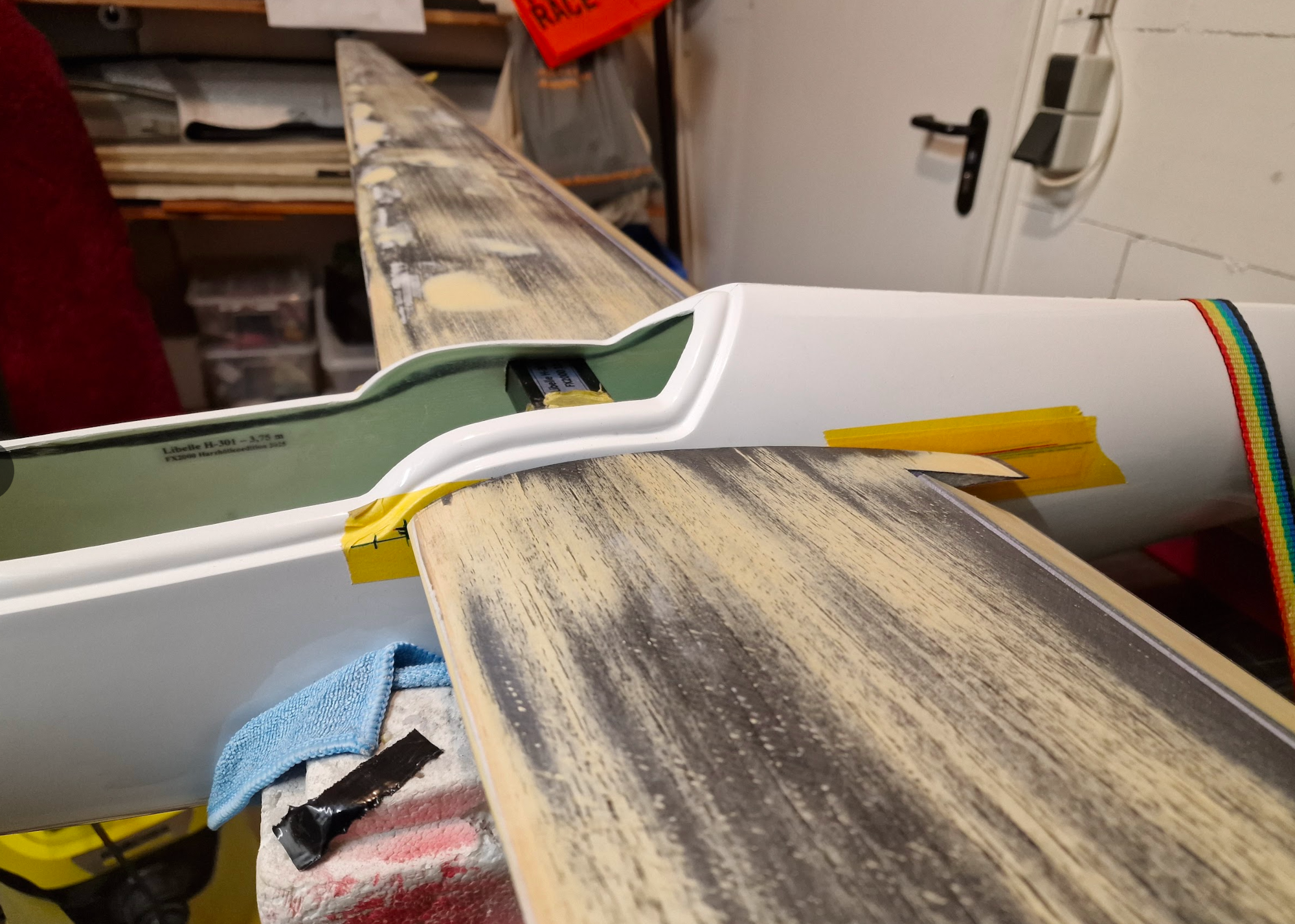 Das HR ist fertig verschliffen und mittig getrennt. Gewicht war, mit noch geschlossener Scharnierlinie, 119g. Die Torsionssteifigkeit ist irre. Da kann ein Schalenleitwerk nicht mithalten...