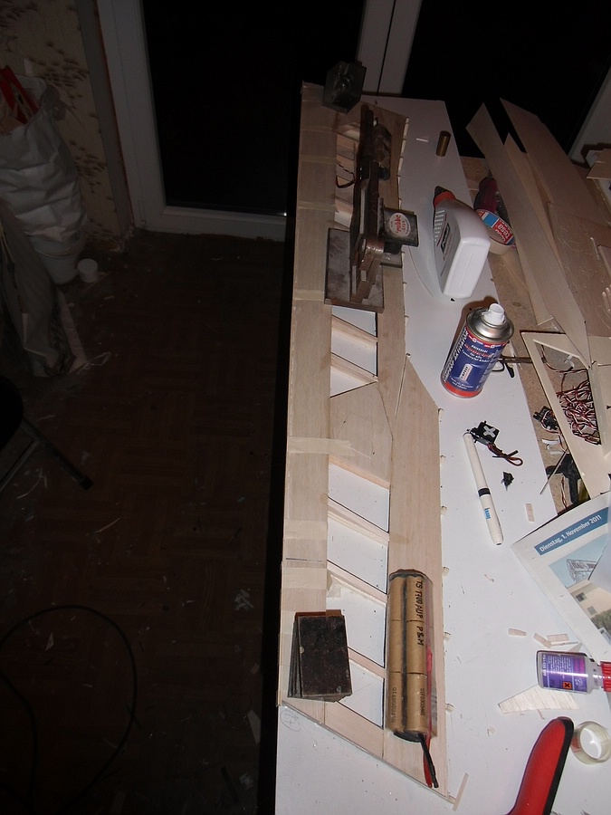 Derzeit härten an beiden Flügeln die heute mit Epoxy und dem 20er Kohlevlies aufgebrachten Endleistenbeplankungen aus, rechts unten und links oben.