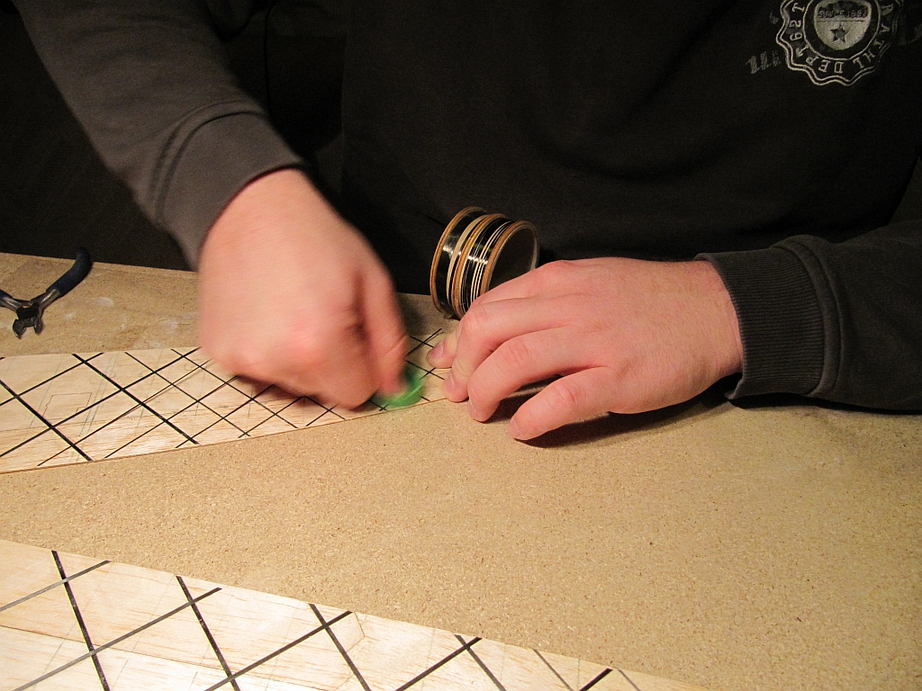 Bin grad an der 2. Fläche am oberen Holm... An der ersten bin ich bis auf die obere Beplankung fertig, ich habe keinen dicken Sekundenbapp mehr, bzw höchstwahrscheinlich zu wenig und das könnte dann peinlich werden. :roll: Verbrauch bisher 2,5 Flaschen dünner, ich tränk alles so richtig gut, soll ja was aushalten können der kleine :thumbup: