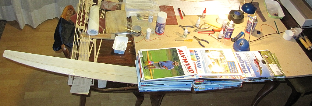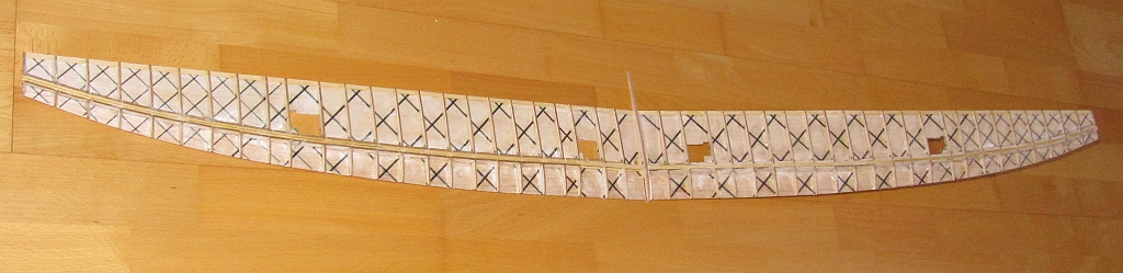 Naja, das glaub ich weniger, hoffe es aber vielleicht..... :wink: Bin grad an der ersten Fläche mit den Rippen und Holmen fertig, mitten in den Verkastungen.
