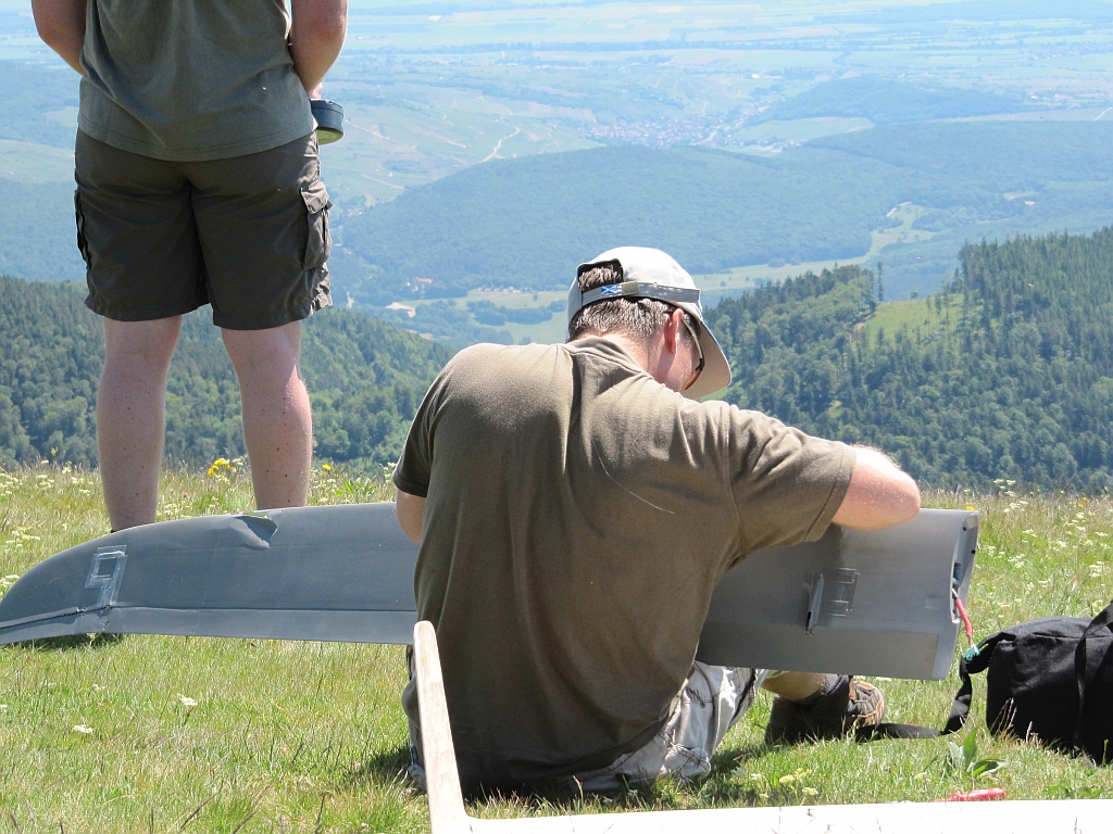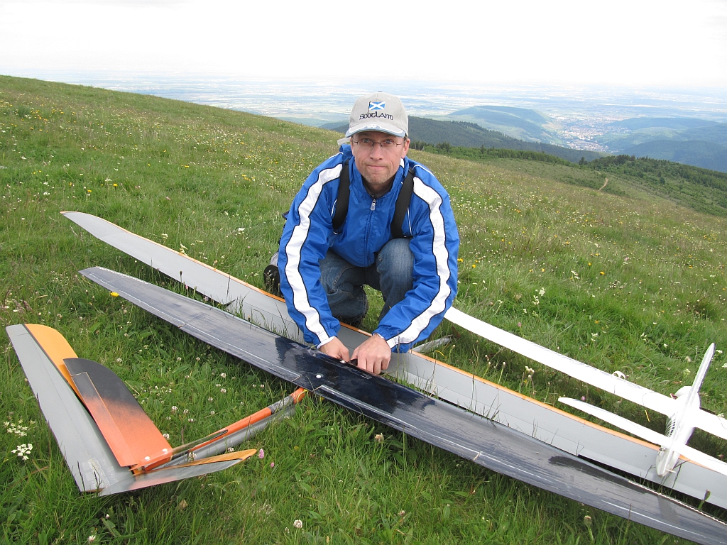 Wir waren wieder mal über´s Wochenende in den Vogesen, Michel war ja auch schon da als erste Vorhut für das lange Wochenende. Gestern war es knapp bescheiden, da war Elektro oder DLG angesagt, heute ging es dafür teils richtig gut ab und ich bin 197km mit dem Astir geflogen bis ich ihn beim letzten Start schlecht geworfen habe und er in den Zaun gedonnert ist... Rumpf ist 3-fach angebrochen, SR-Spant ist rausgeflogen und am Randbogen fehlt ein Stück. Dafür das er ein Rad geschlagen hat über beide Randbögen und den Leitwerksträger ist es aber glimpflich abgegangen. Was solls, bis Mittwoch ist der wieder fit, wenn auch vielleicht noch nicht komplett mit Lack!? Egal.
