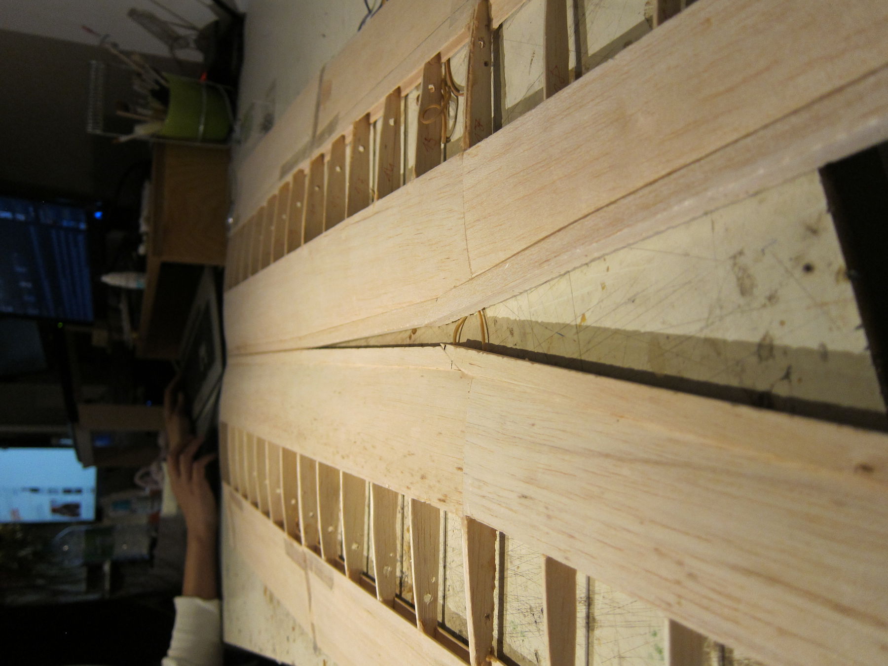 Und los gehts mit dem Balsahobel über den ich im RCN gelernt habe dass ich den ja garnicht kennen darf weil ich der Altersklasse U70 angehöre... Langsam und vorsichtig immer weiter ran... Irgendwann hats dann die Konturfortführung der Beplankung gekriegt So dann von oben und unten... Schöne lange Löcklein -- das freut das Herz