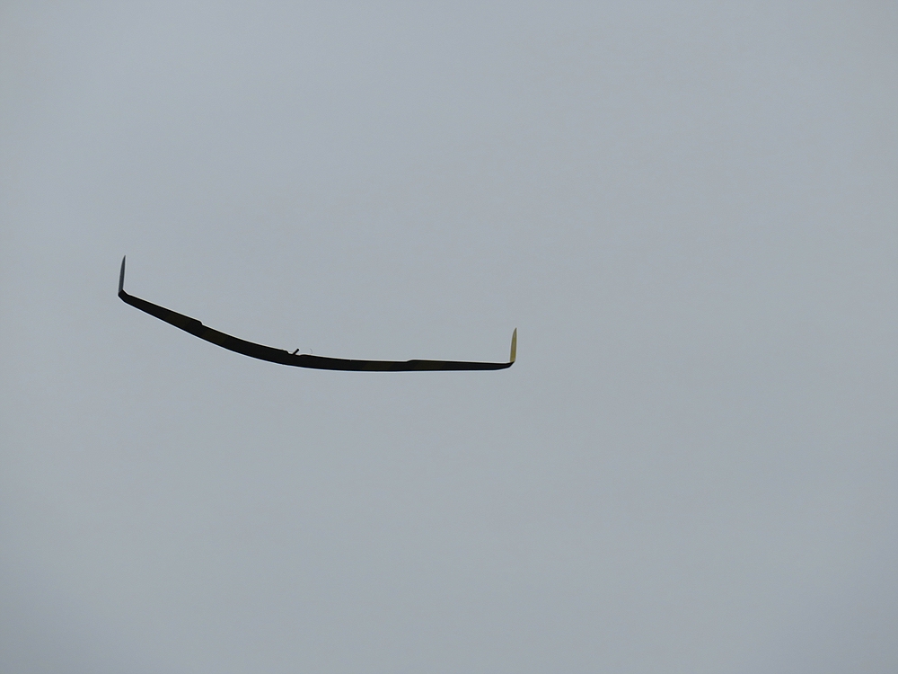 Der große Pfeil tat heute fast was er soll, flog jedenfalls ziemlich normal und flott, auch im DS mit bis zu 161 km/h....dann hat der provisorische Holz-Bio-Wingletverbinder statt des im Auto liegenden GFK-Stabs versagt und das rechte Winglet ist alleine weiter geflogen. Jörg konnte den Dispar mit nur einem Winglet heil landen und es zeigte sich wieder mal dass immer nur die Winglets an den Pfeilproblemen schuld sind :P